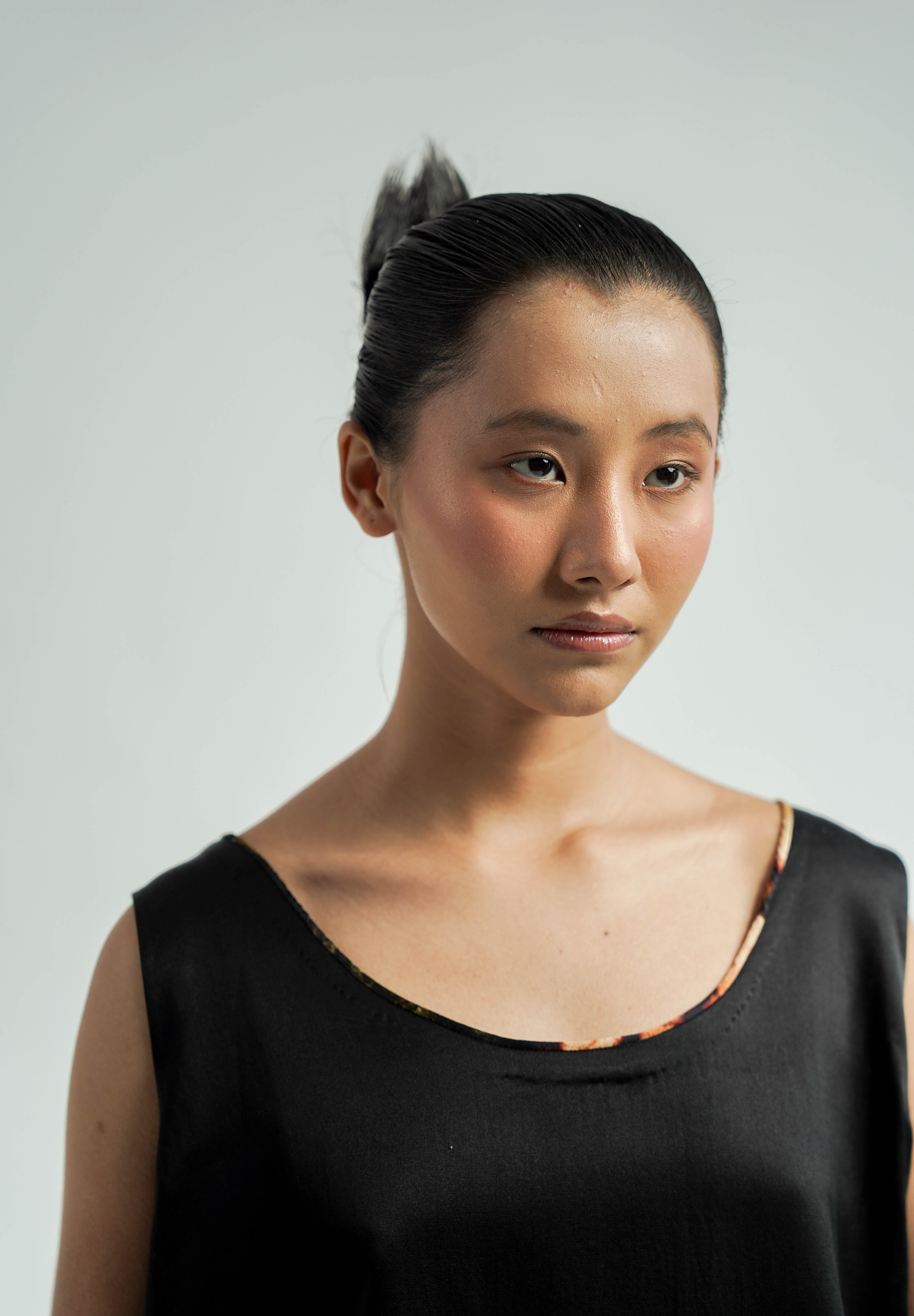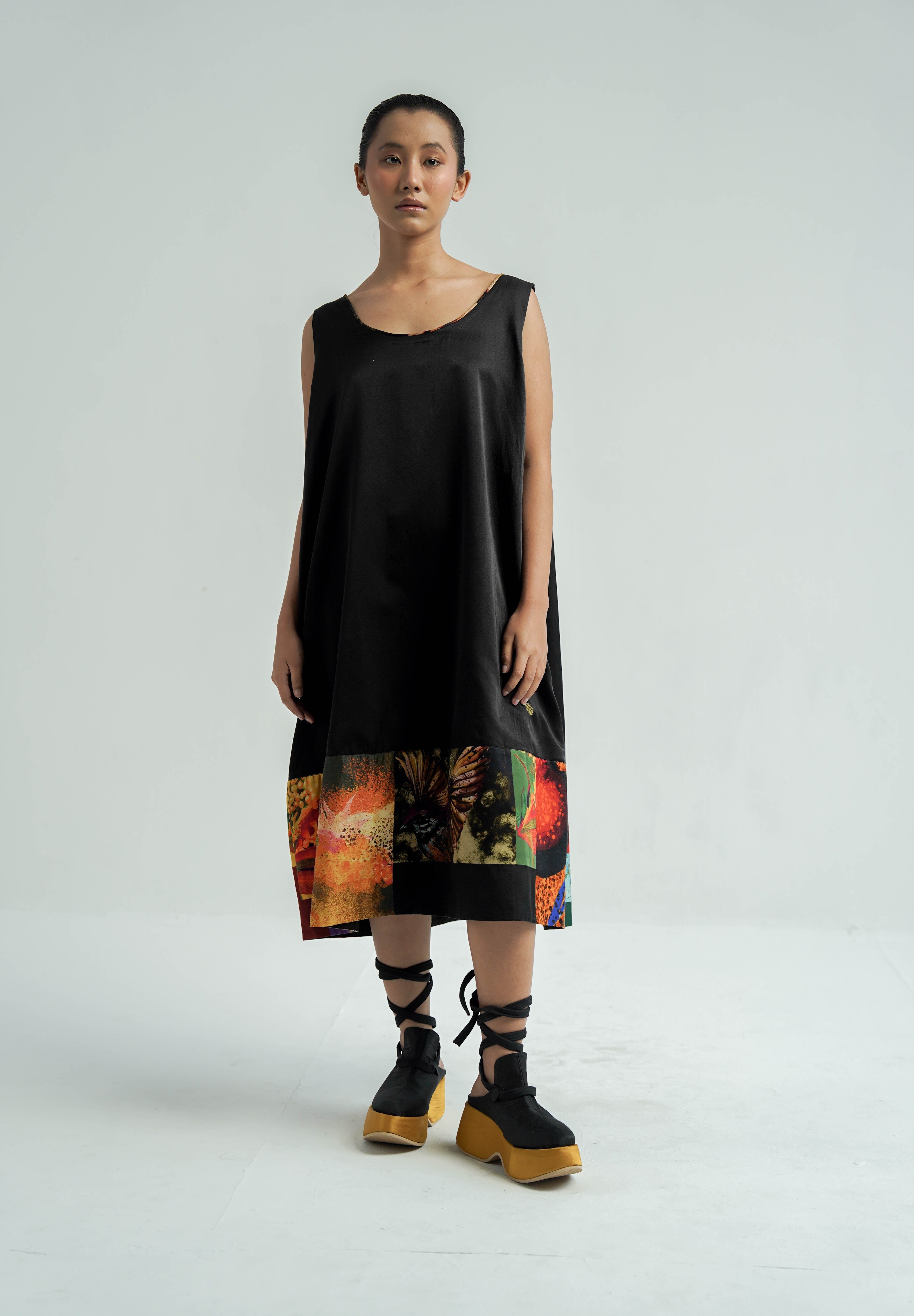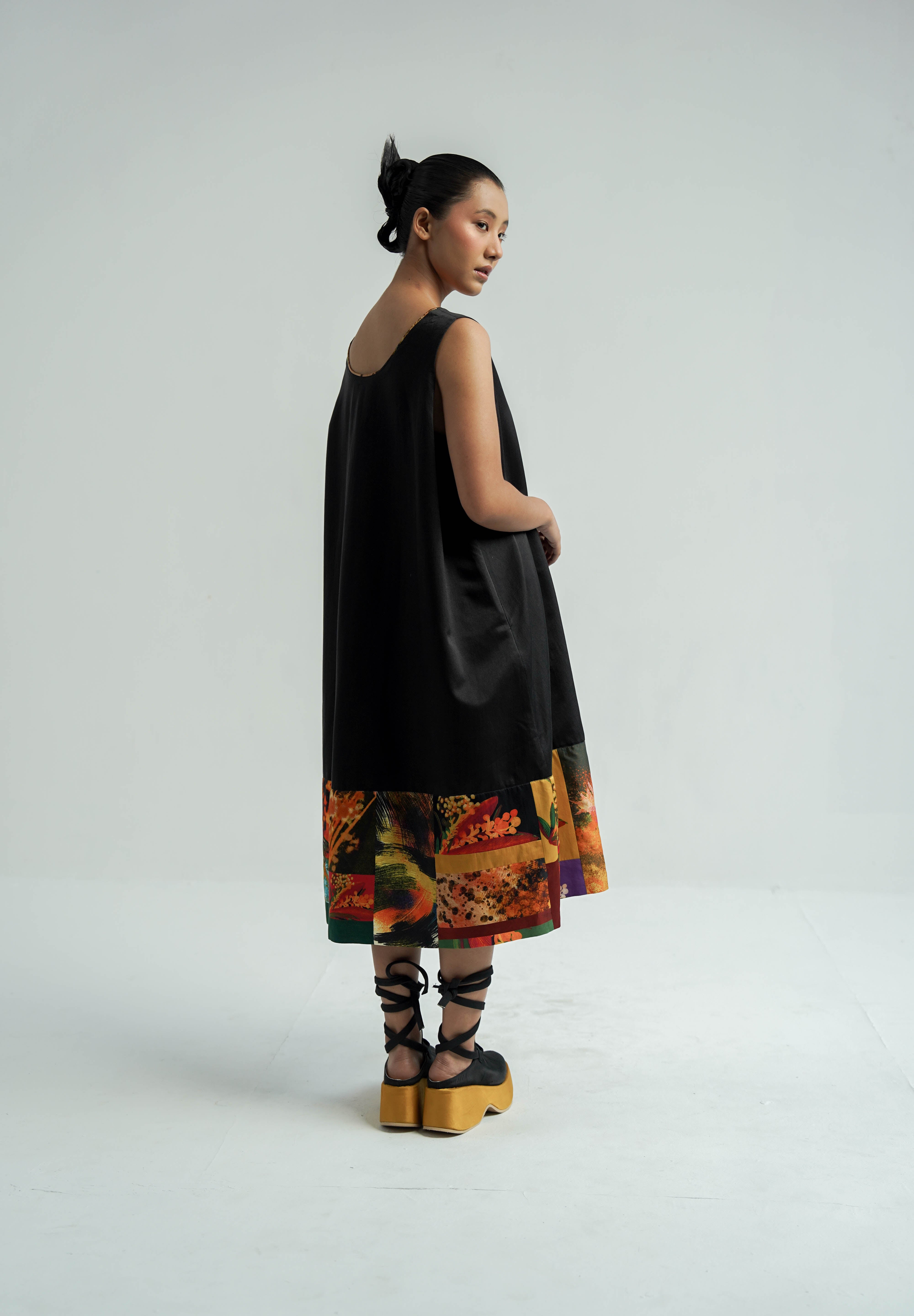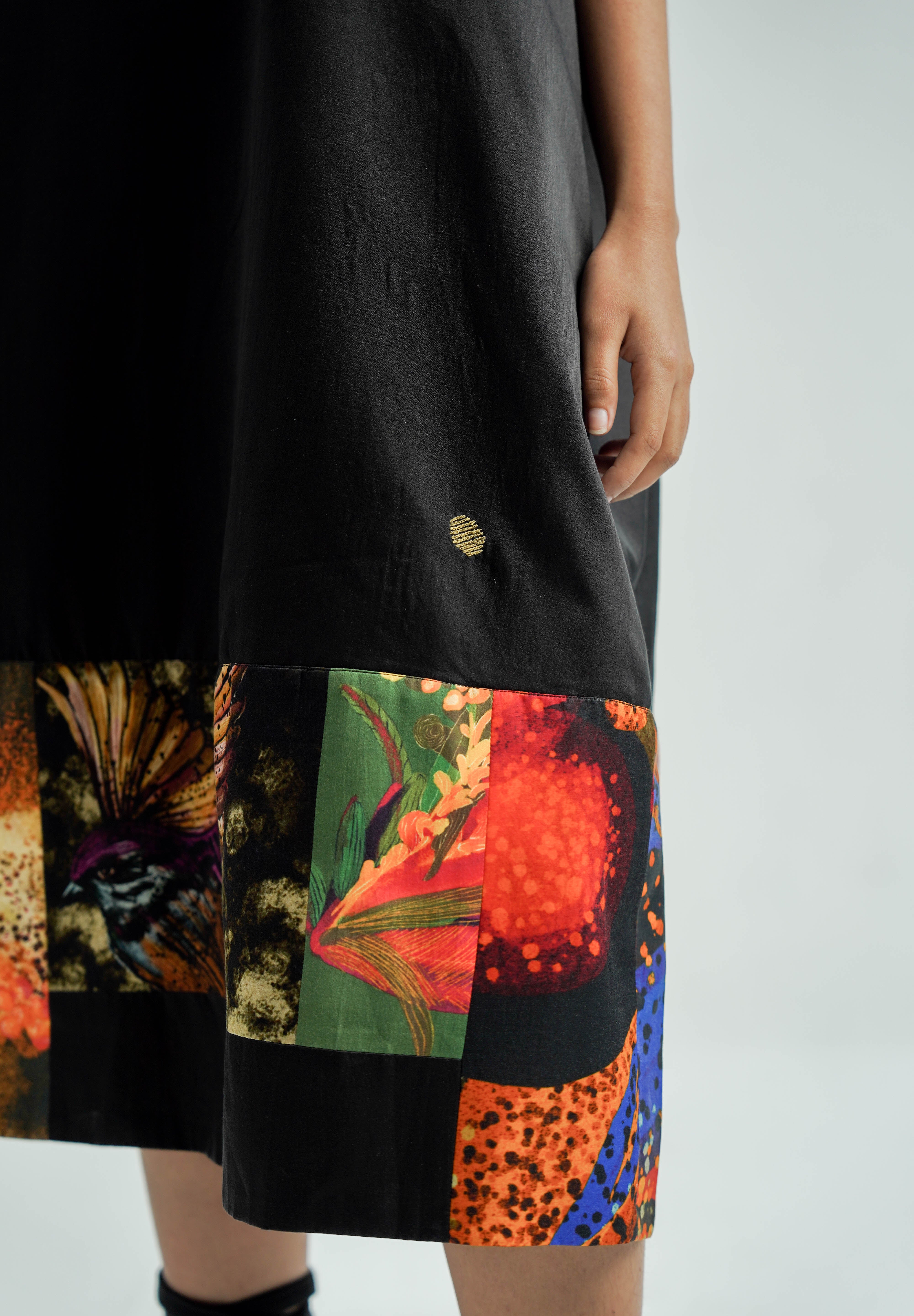 Crafted from luxurious silk, this slip dress features a hand-dyed black palette with hand-painted print patchwork at the hem. It offers a relaxed, straight fit and convenient side pockets, blending elegance with practicality.