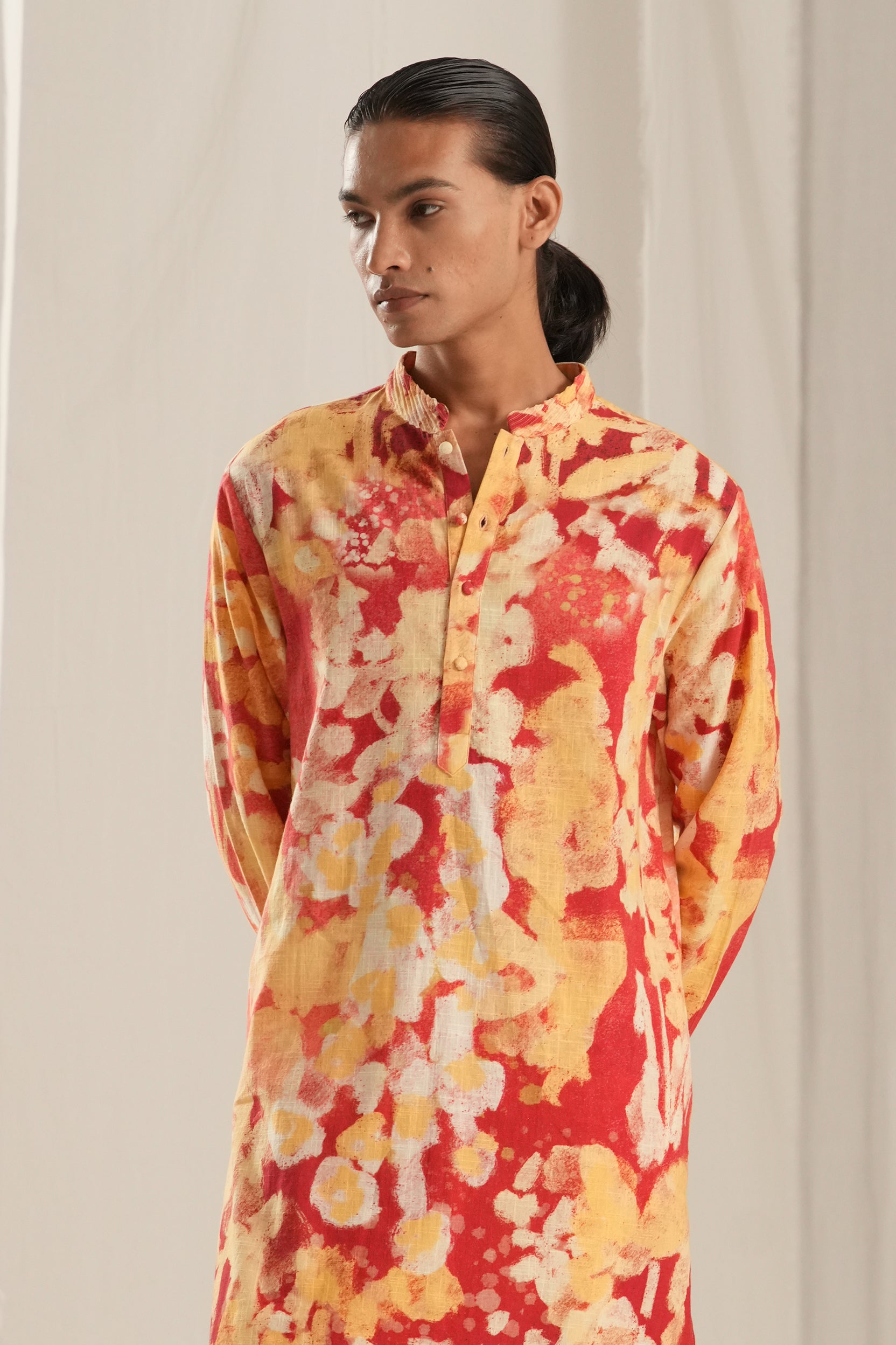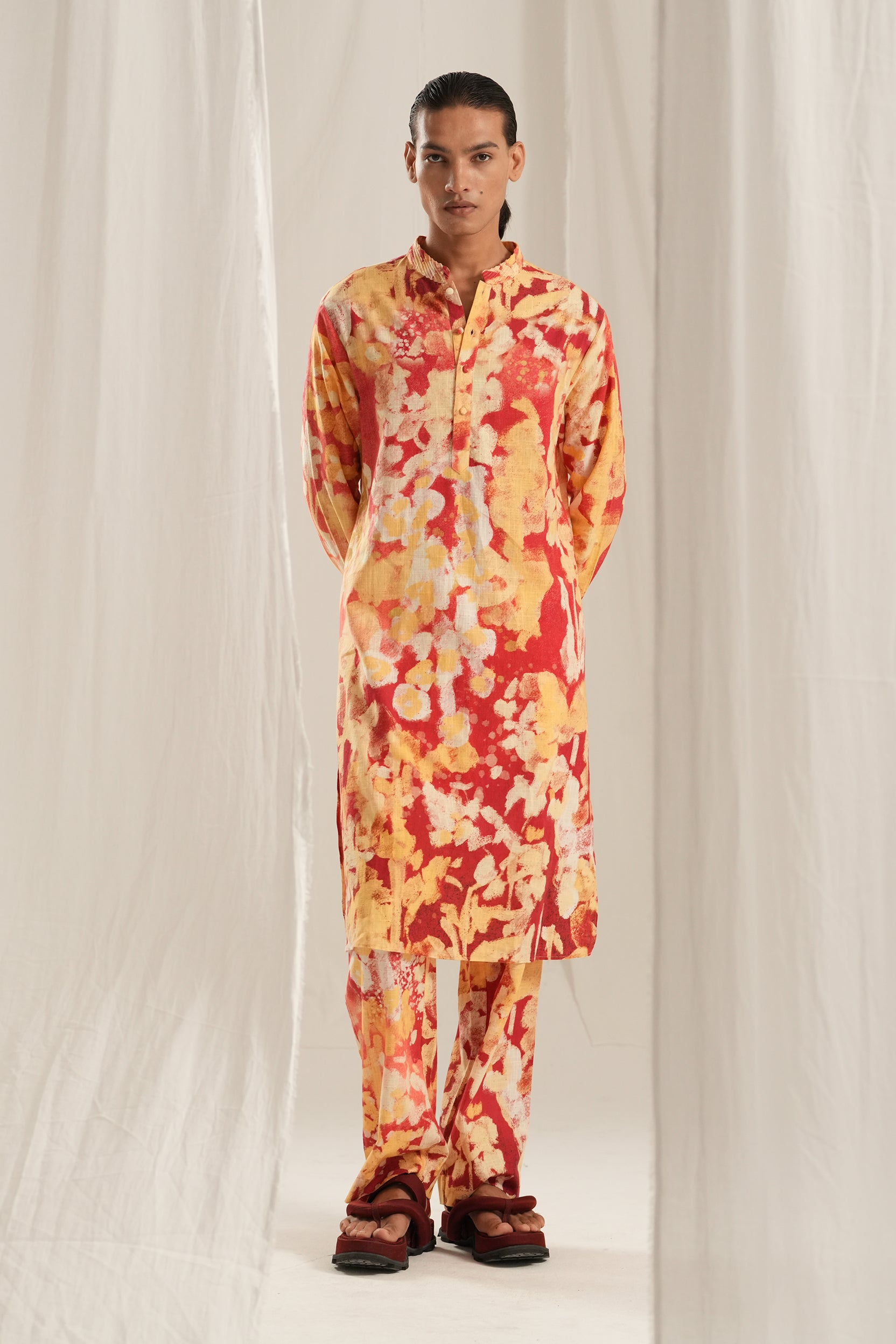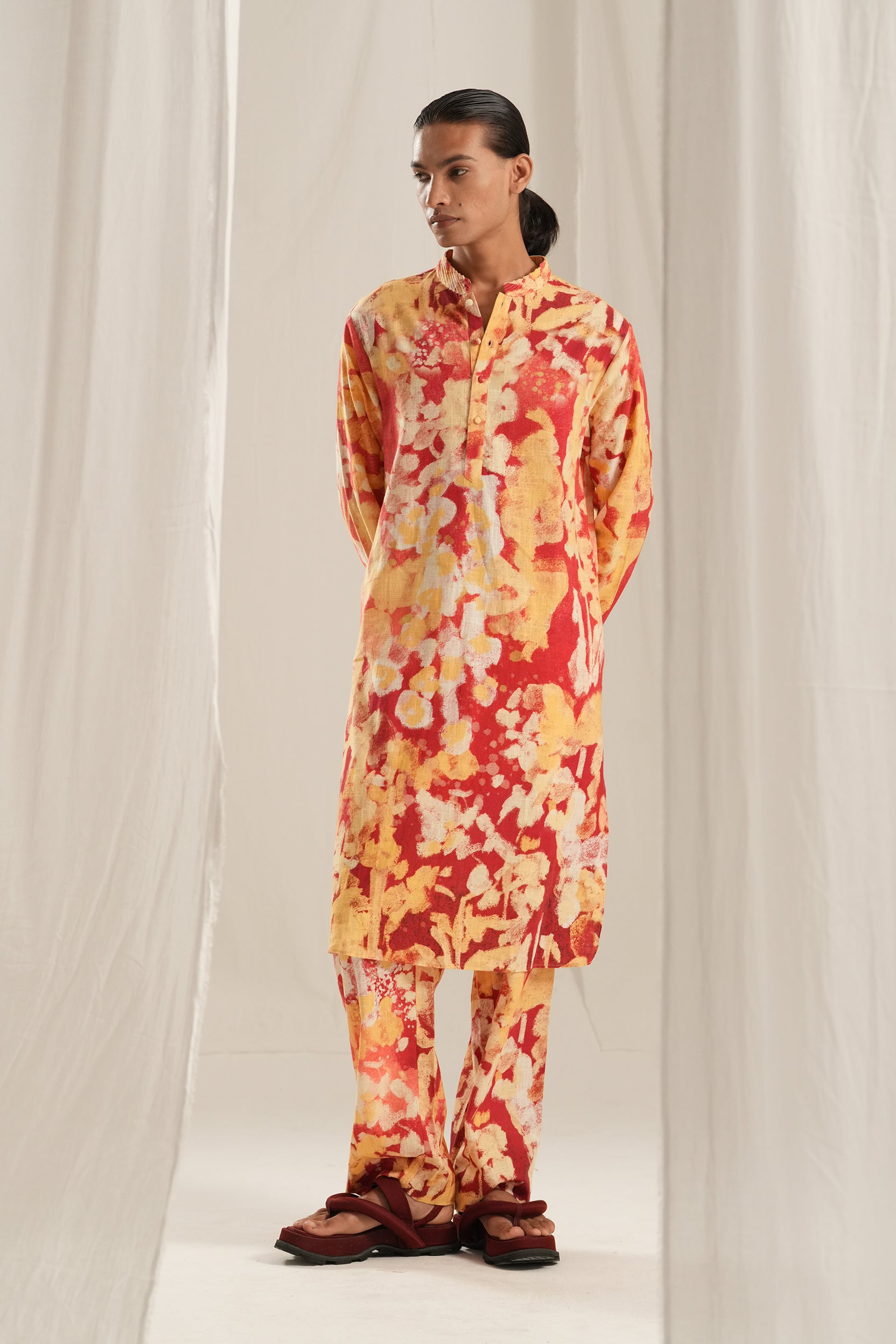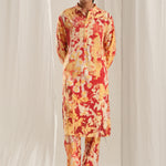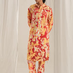 This kurta set is made in soft cotton, featuring hand painted digitally printed florals in soft shades. It has pockets on both sides. It is paired with same printed bottoms that are elasitcated at waist and is relaxed fit.