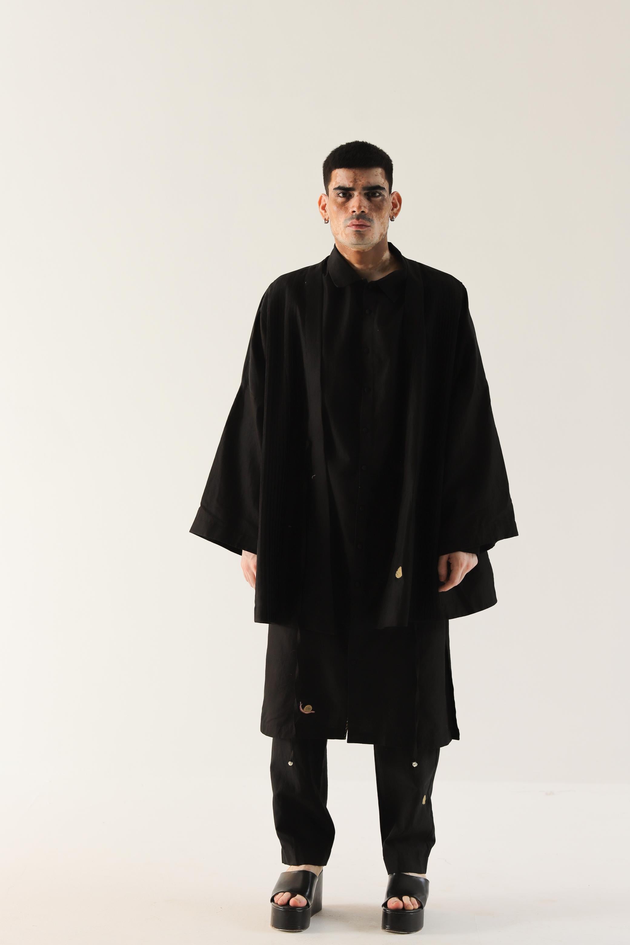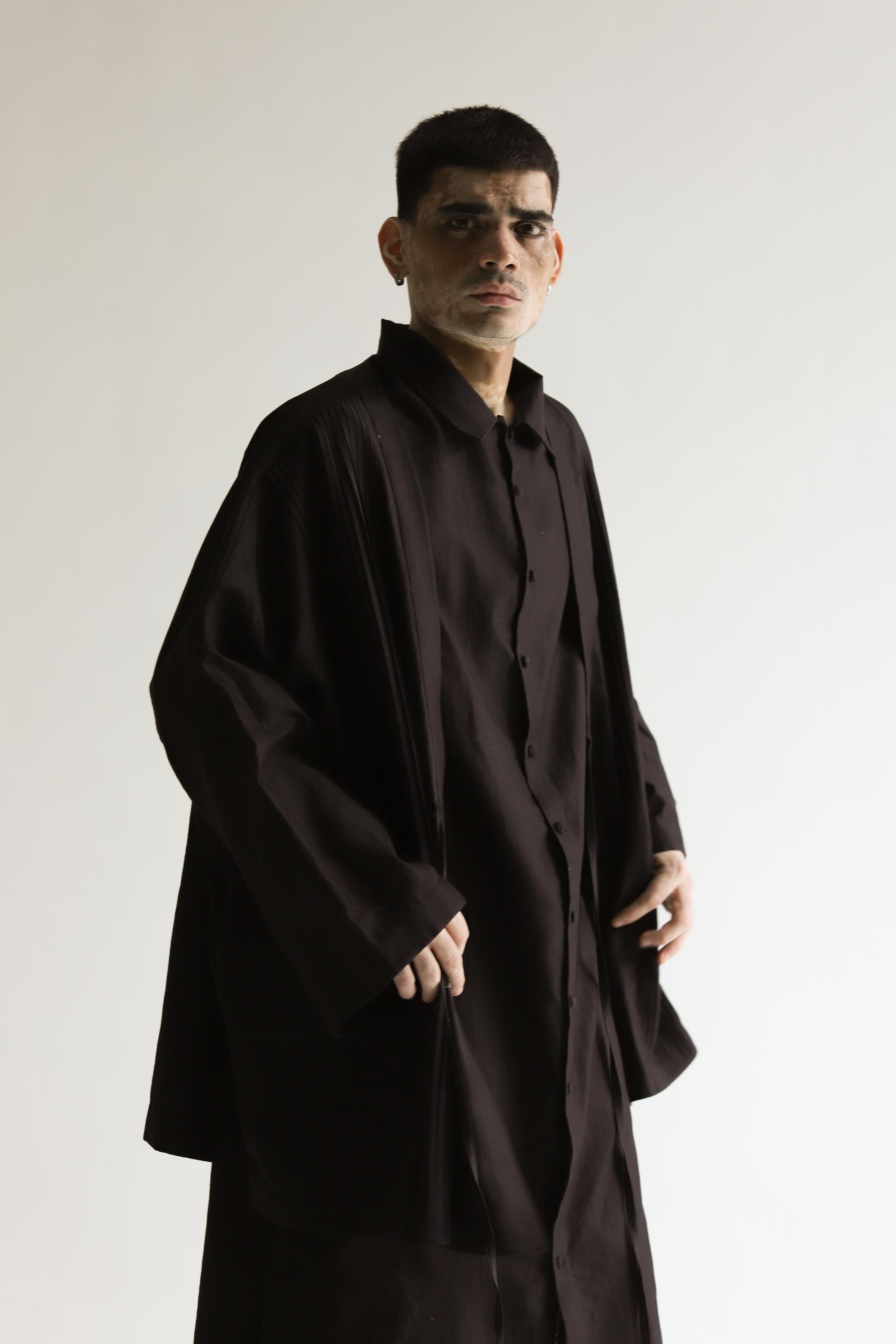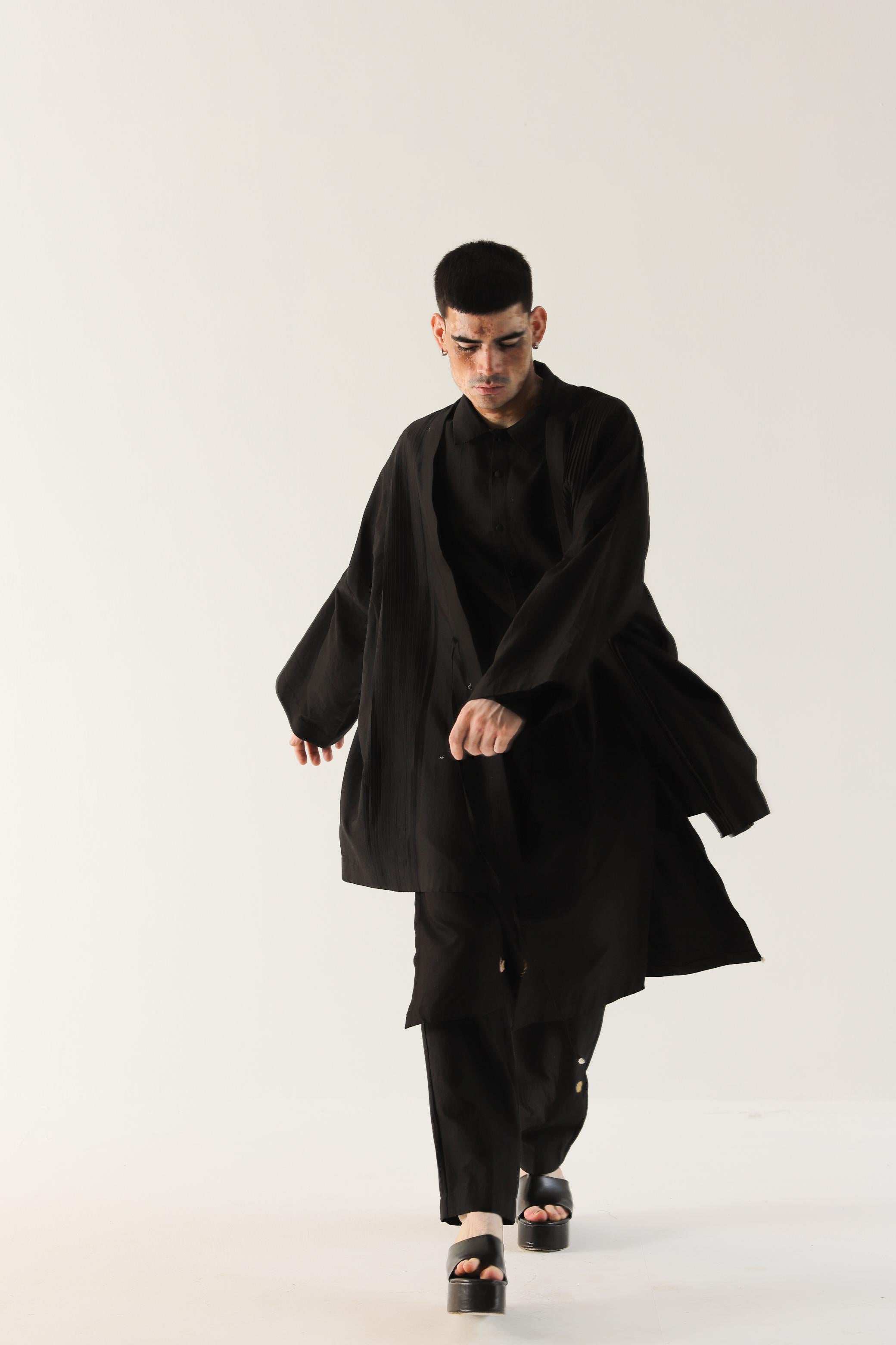 This black oversized overlay is meticulously crafted in chanderi, marrying luxury with comfort. Designed for a relaxed fit that exudes ease and comfort.Finely tailored and finished with a tie up detailling.