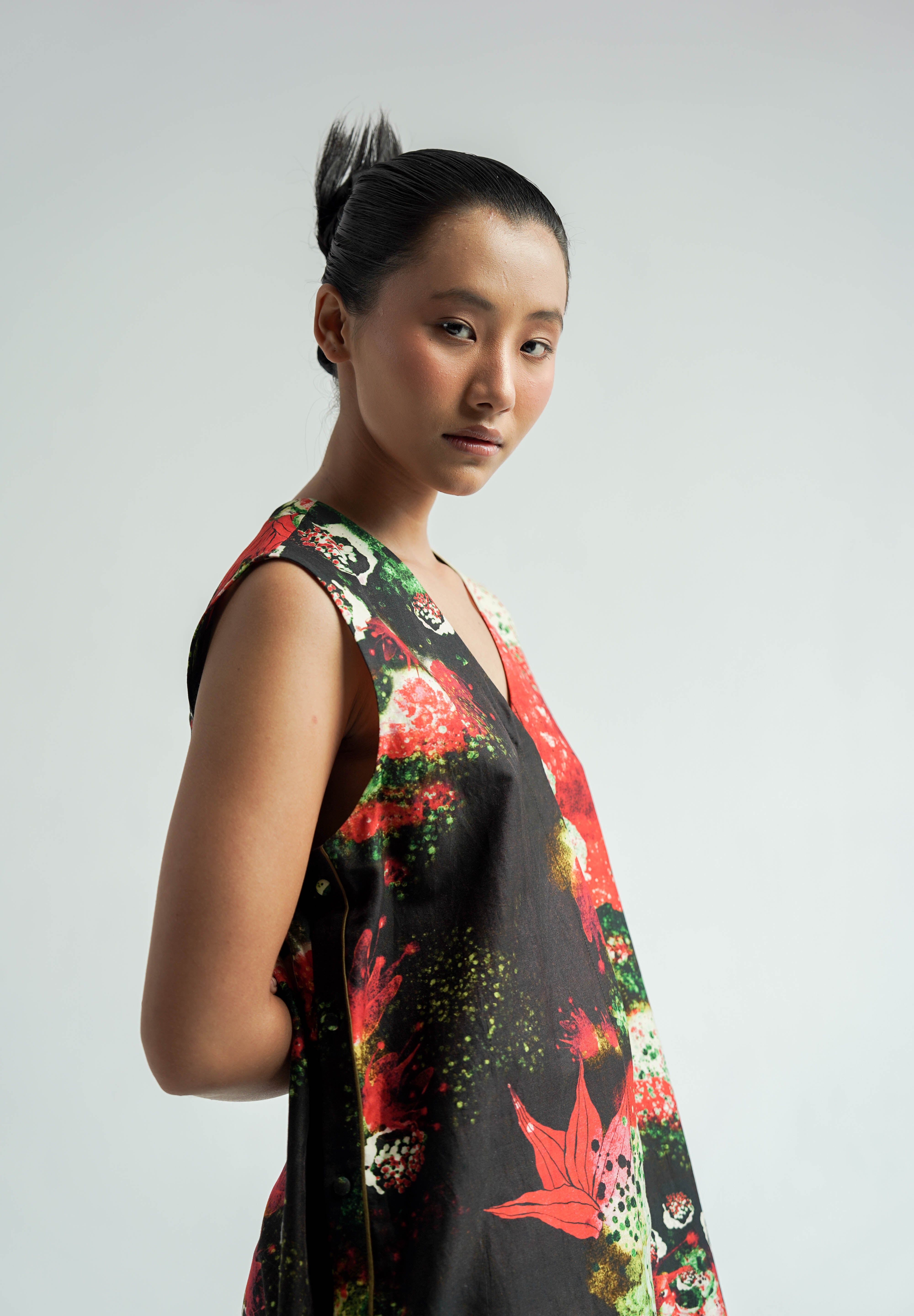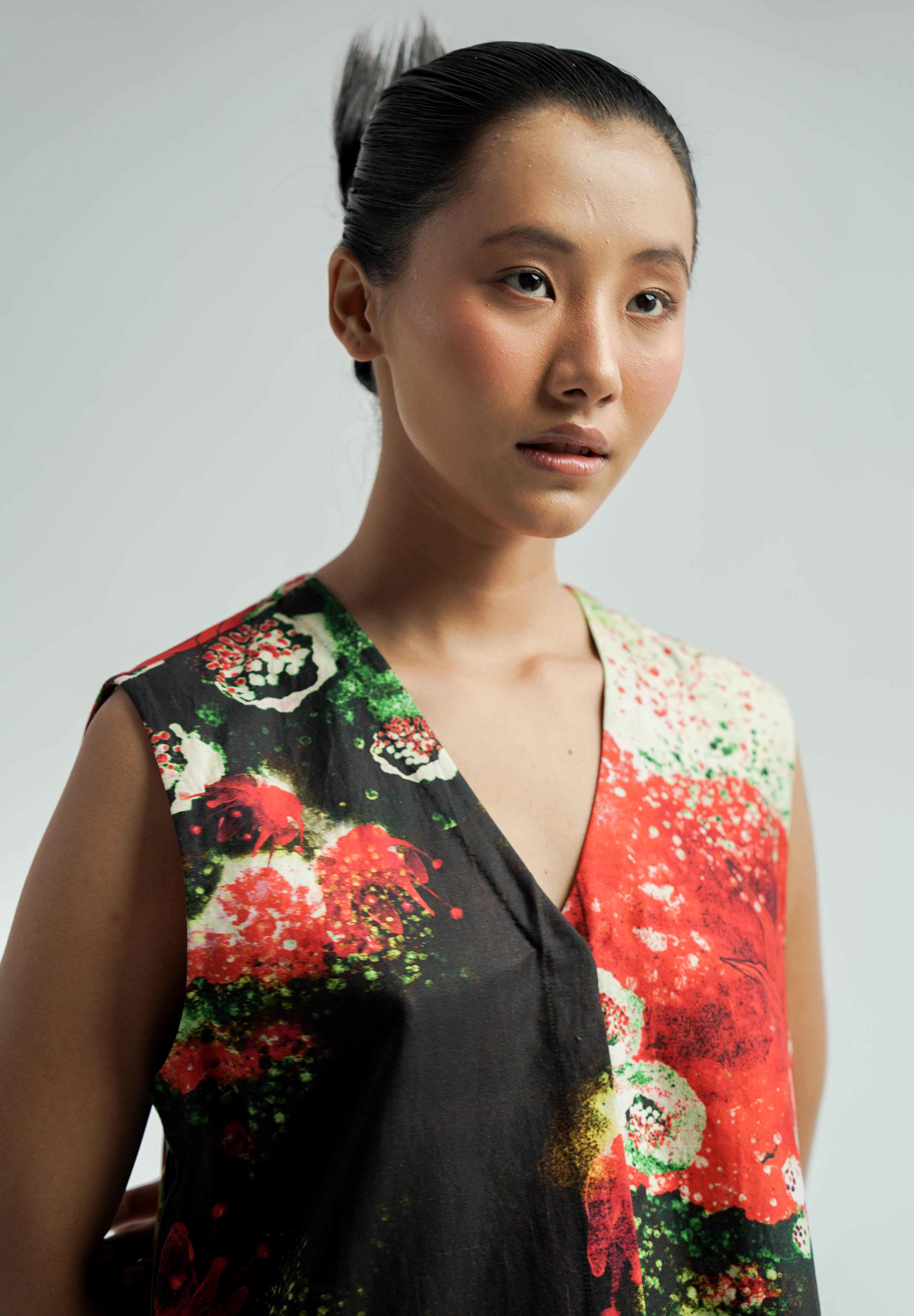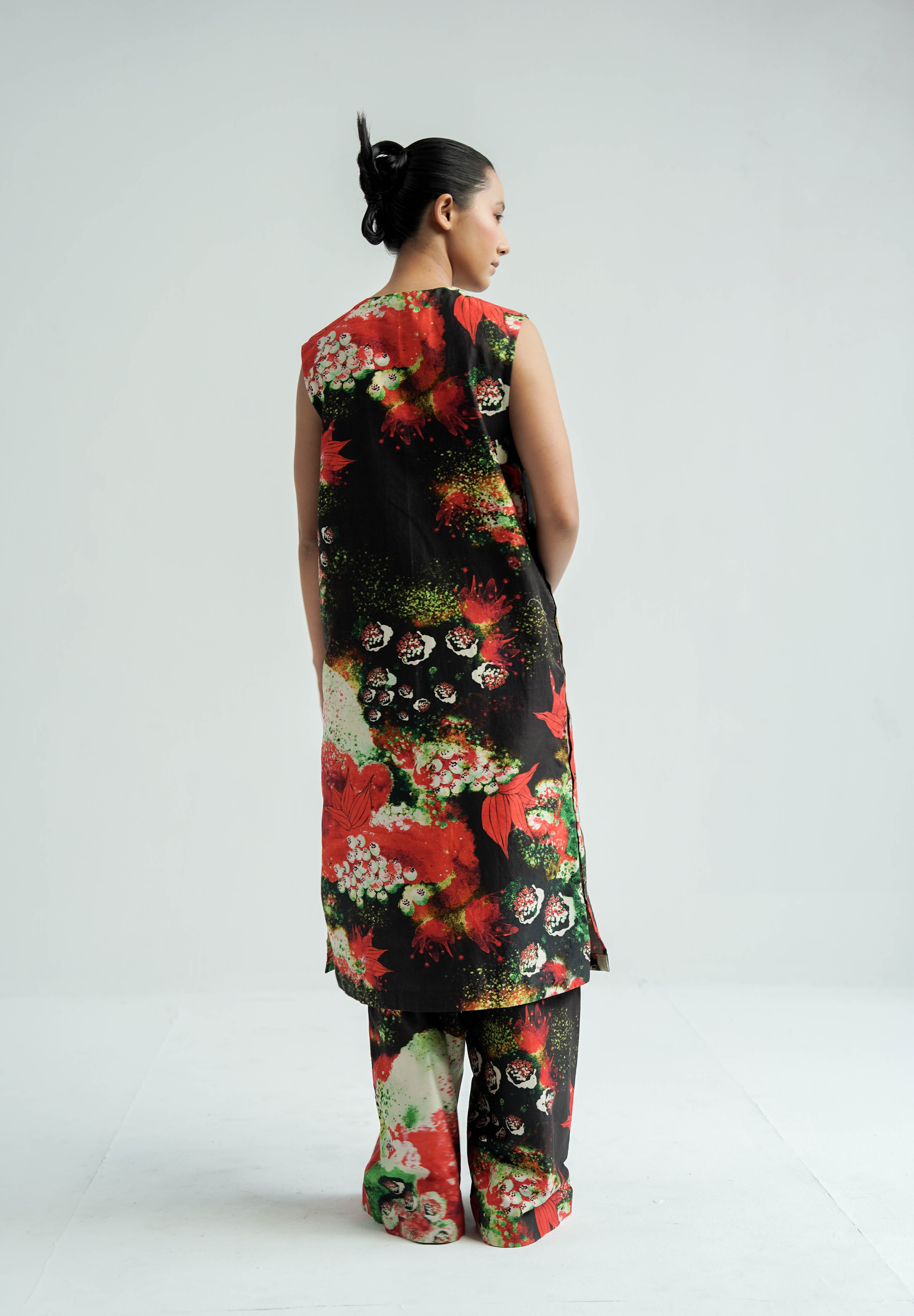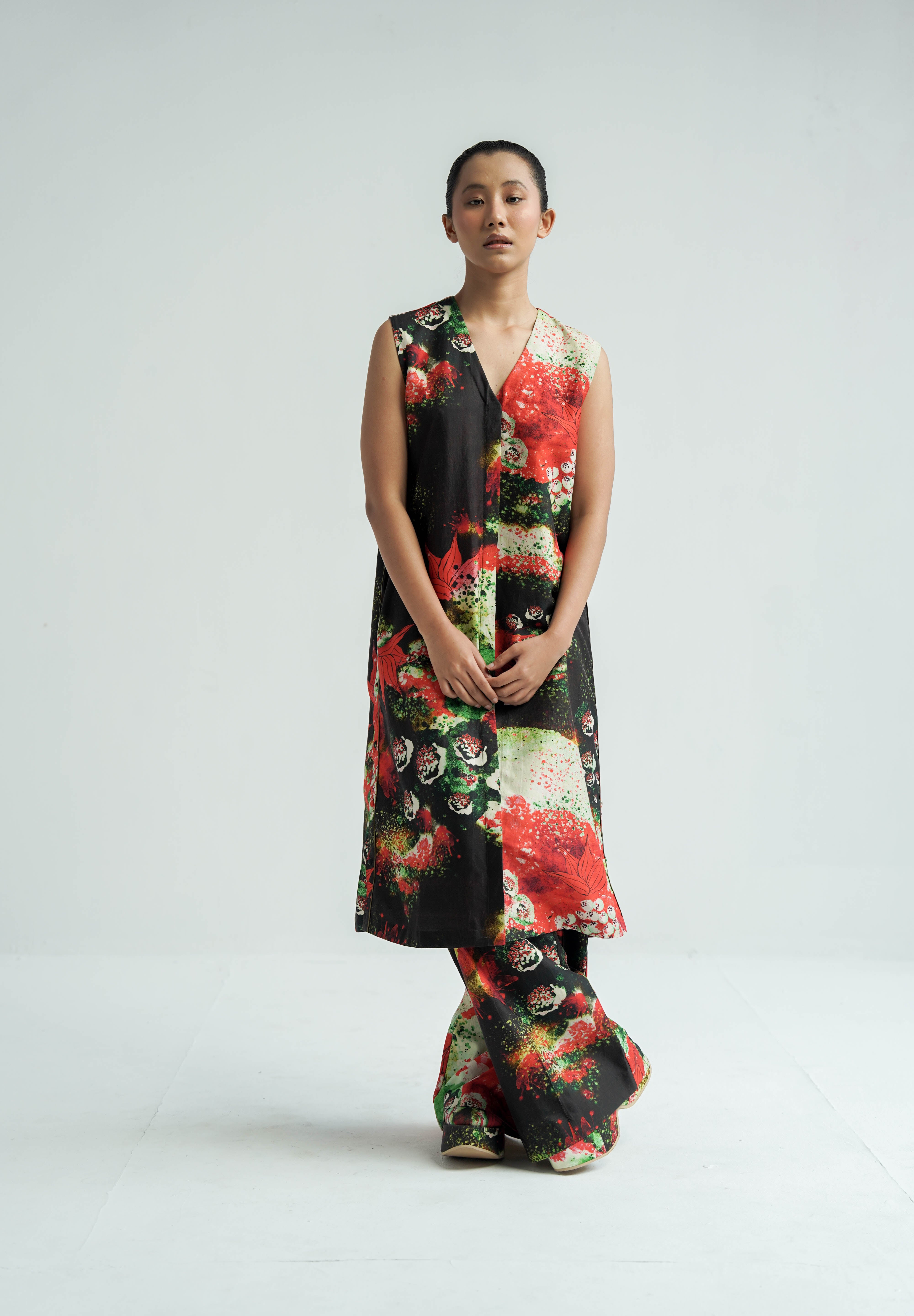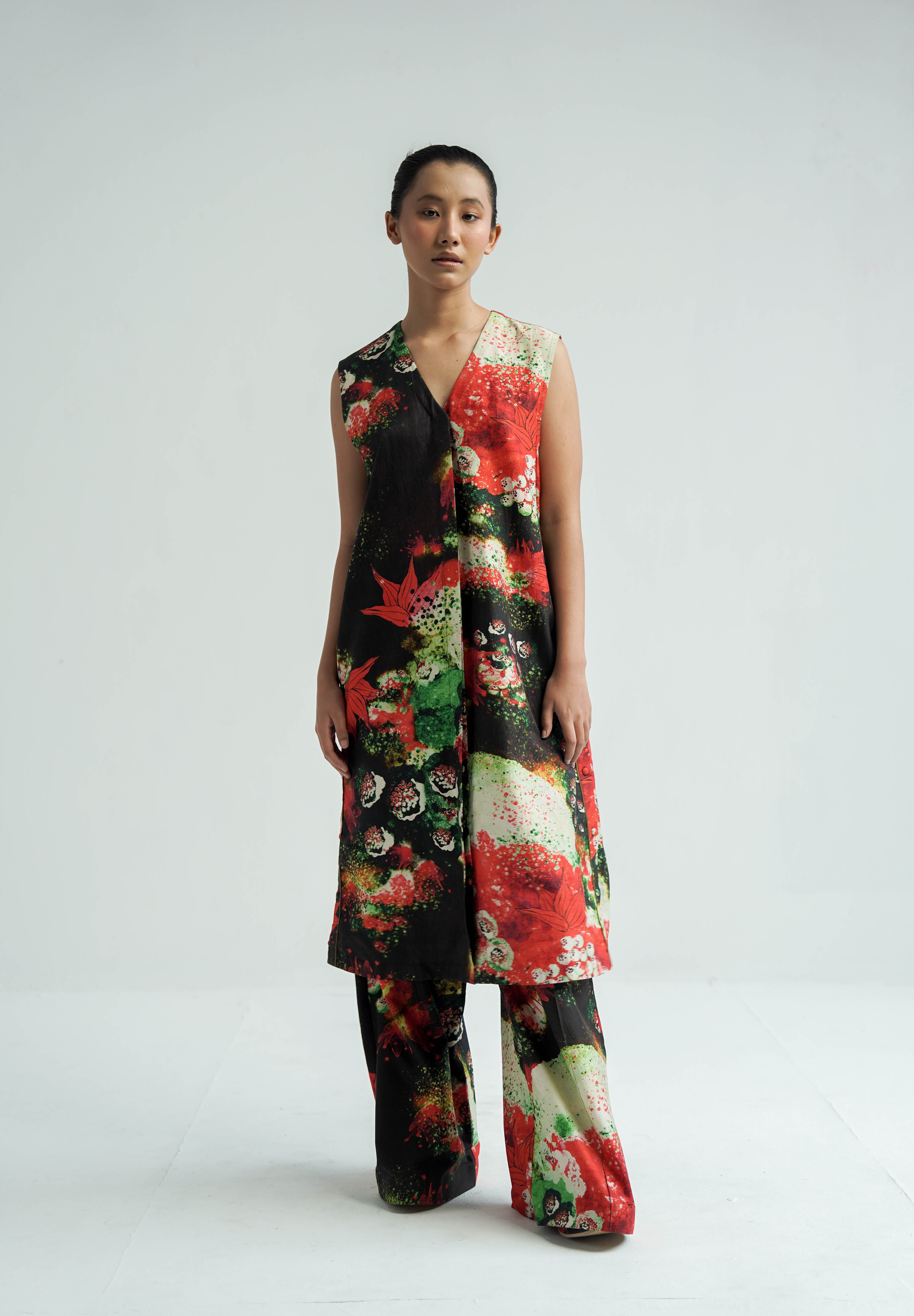 This stunning red Florid co-ord set is meticulously crafted from chanderi fabric, promising a blend of elegance and comfort. The sleeveless top showcases exquisitely hand-painted, digitally printed florals, lending a vibrant and chic appeal. With functional buttons adorning both sides and the front, this ensemble effortlessly marries style with practicality. Paired with wide-leg trousers, it exudes a trendy and refined aesthetic