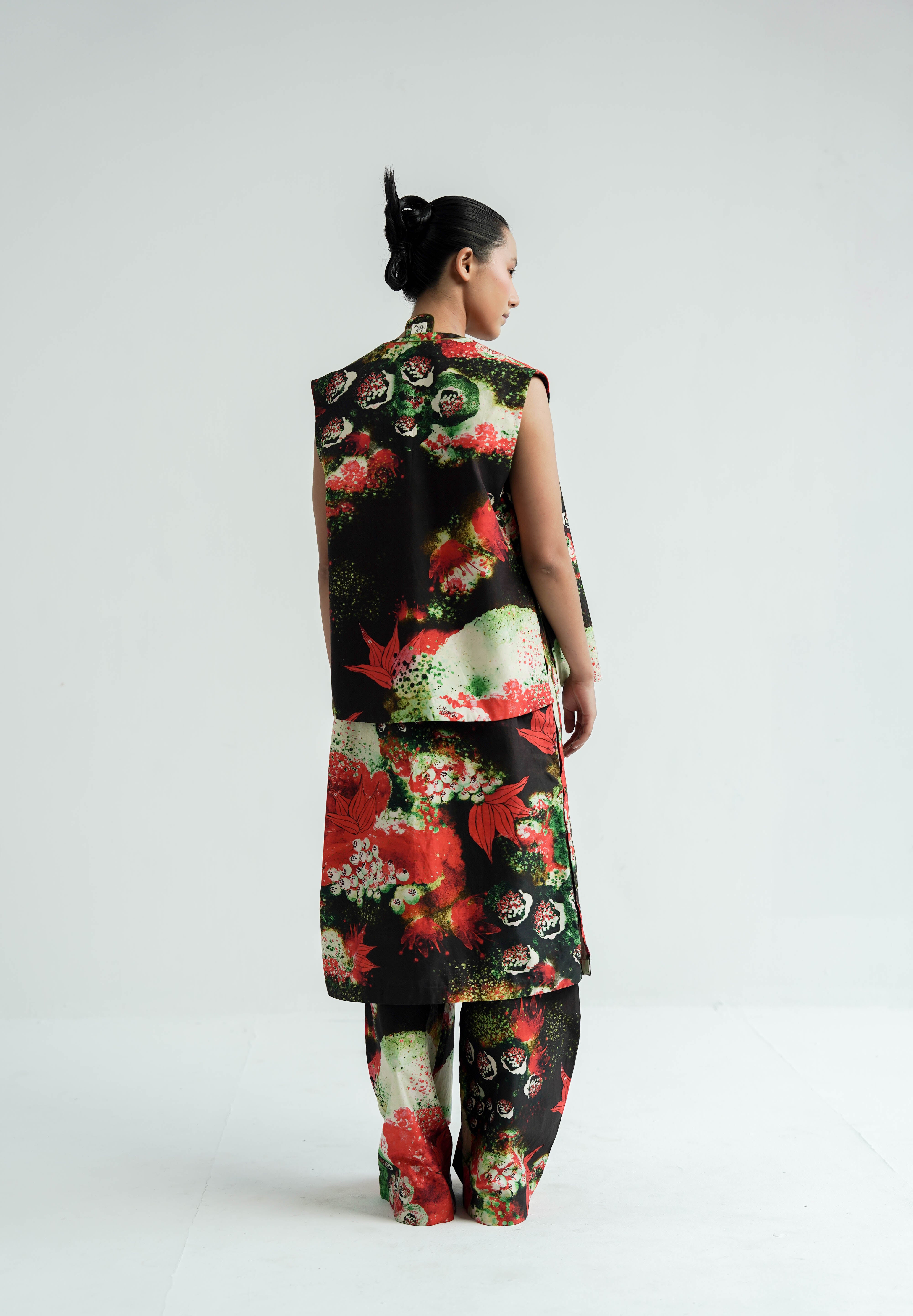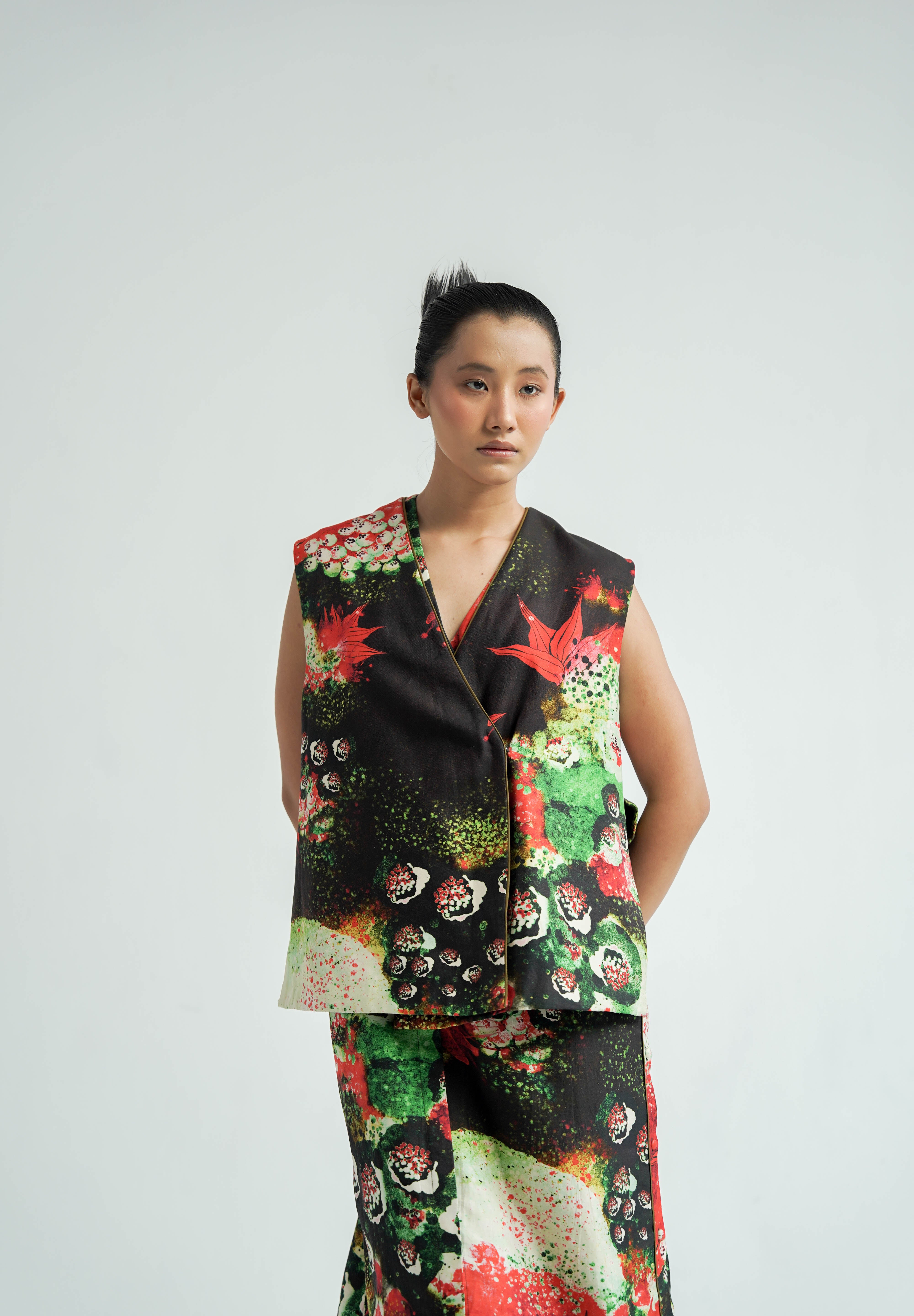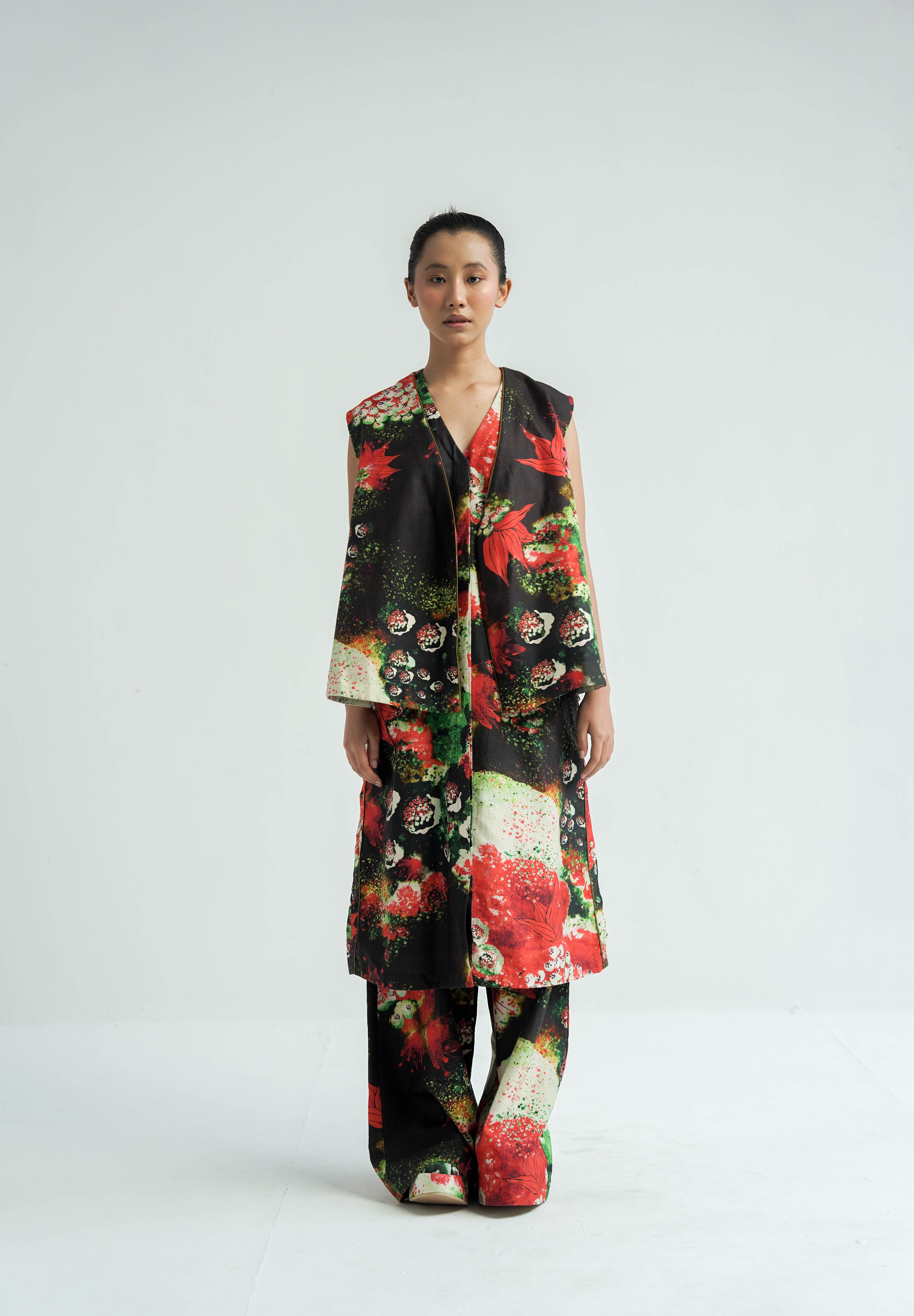 Introducing our vibrant red florid gilet, expertly fashioned from premium chanderi fabric. Designed for a relaxed fit, it exudes casual elegance with its impeccable stitching and finishing touches