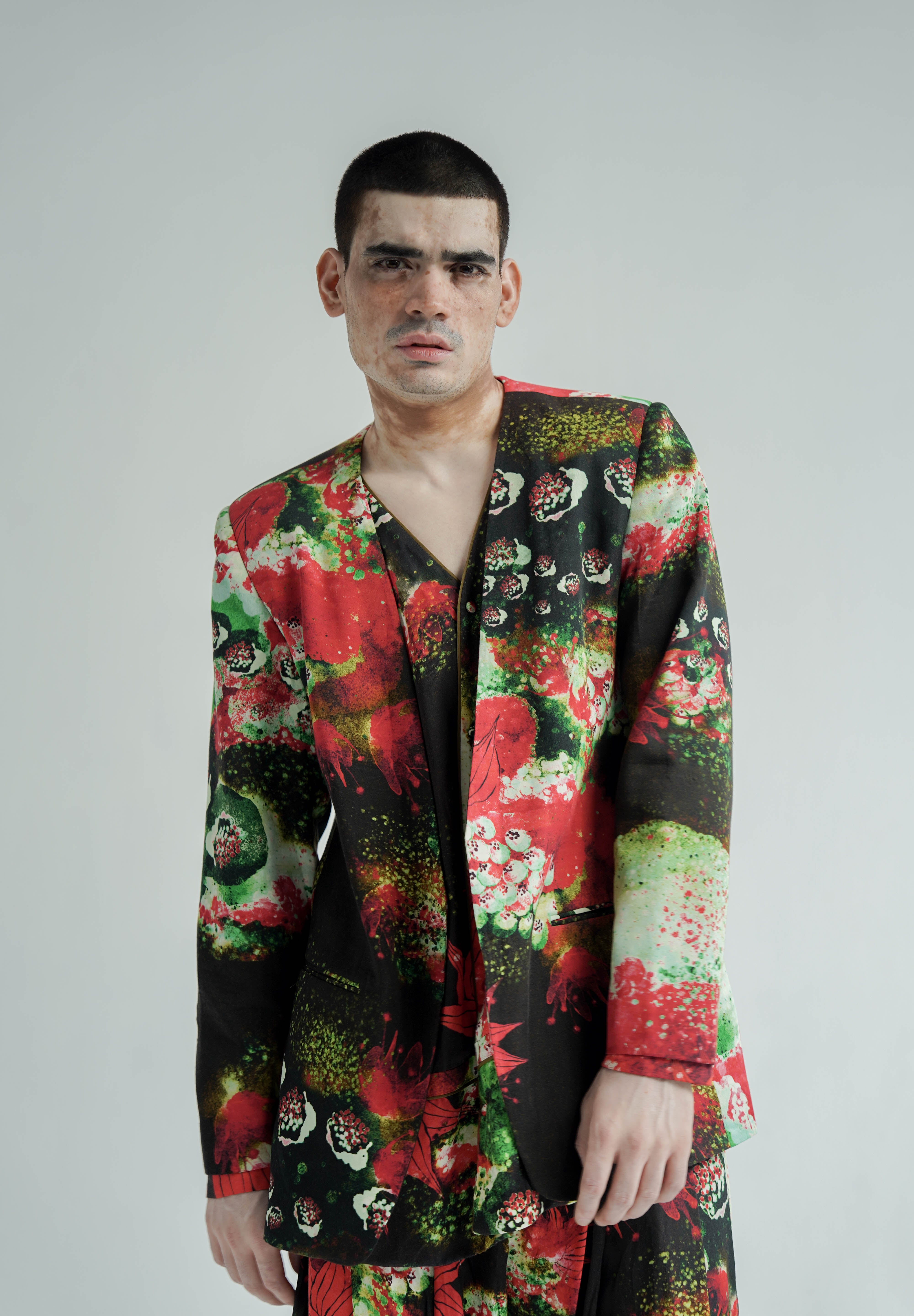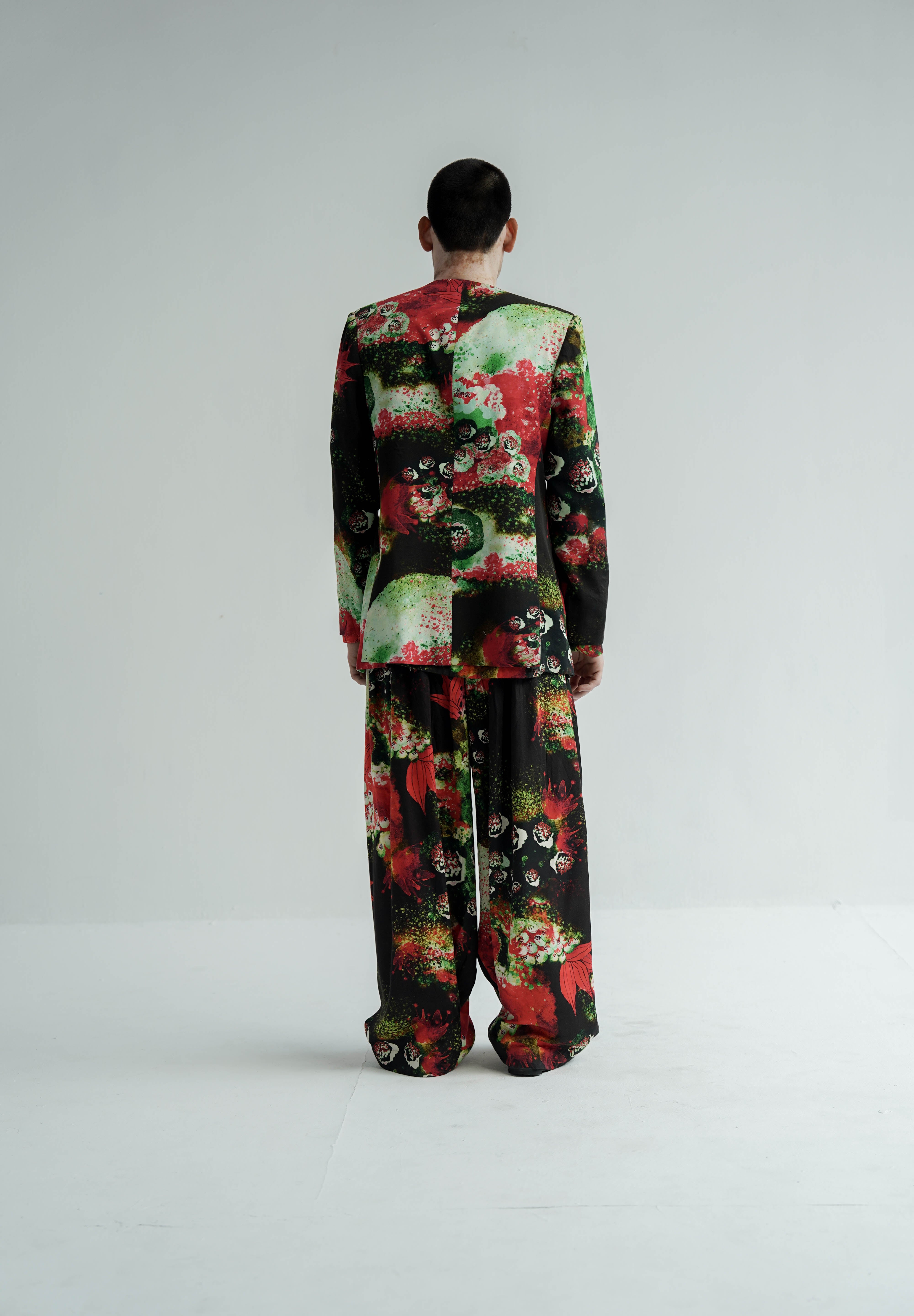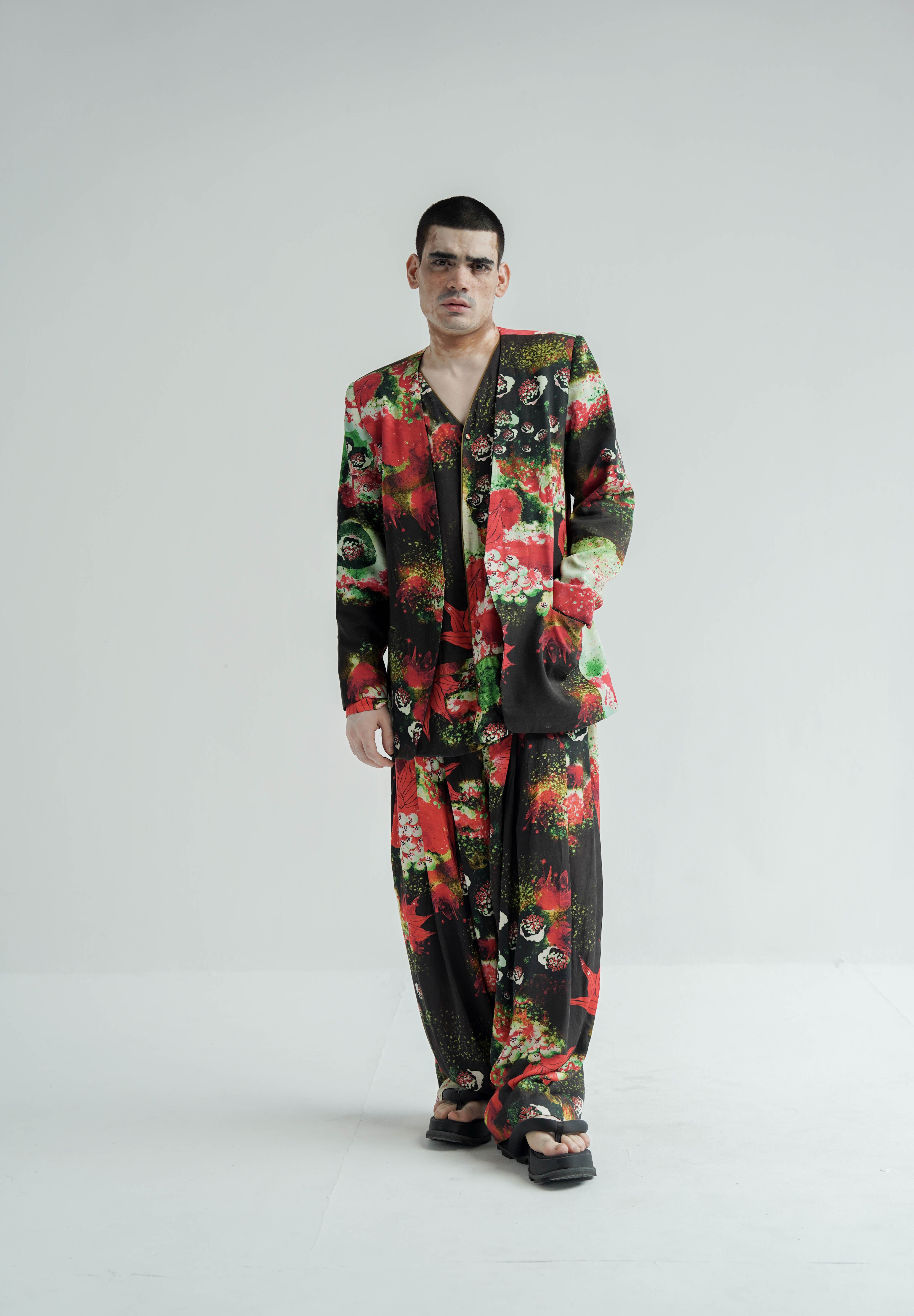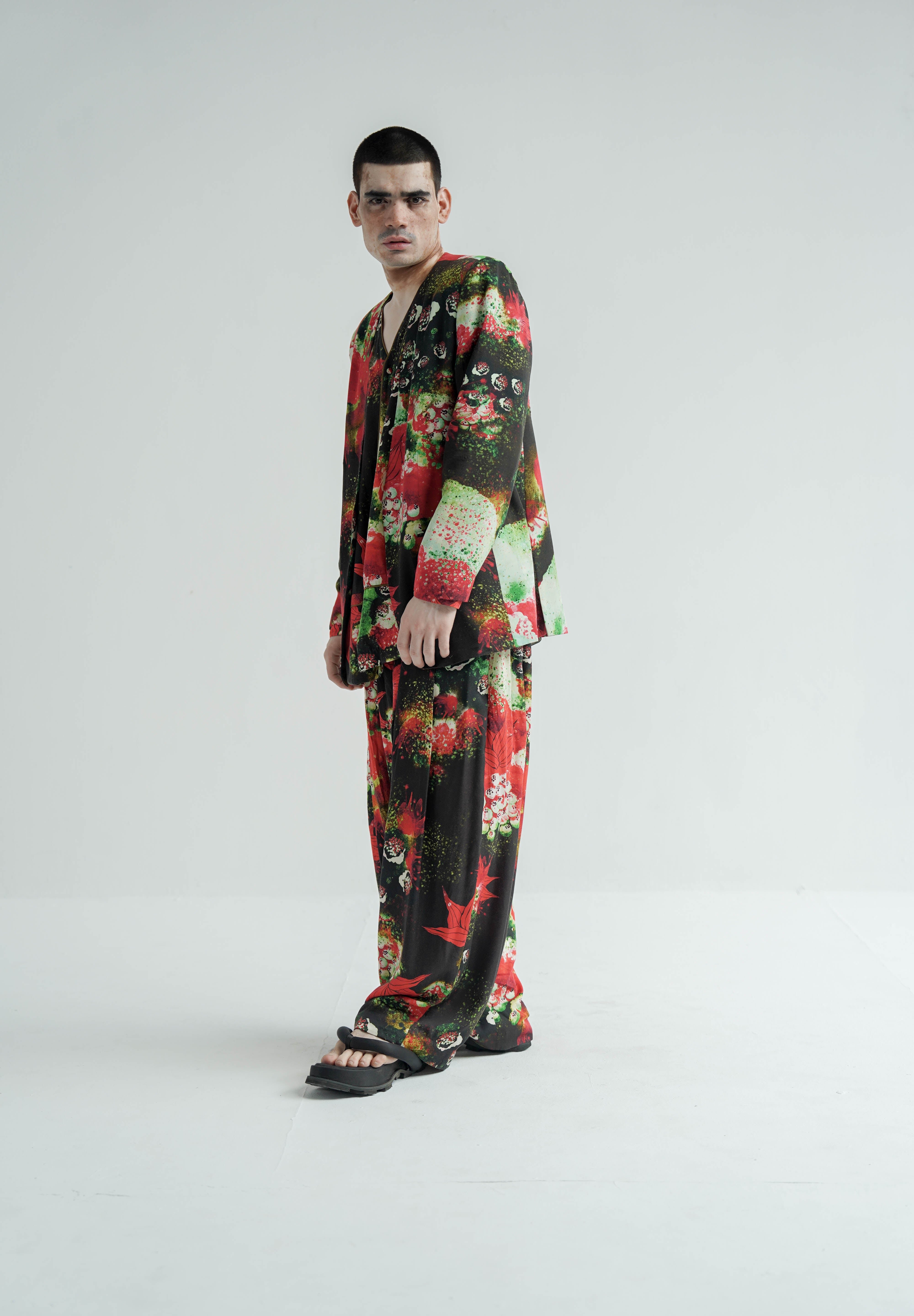 Embrace a dreamscape with the Red Florid Print Jacket, exquisitely crafted from soft cotton. This wearable canvas features a surreal landscape brought to life through hand-painted and digitally printed designs, creating a mesmerizing tapestry of imagination. Its relaxed silhouette and graceful V-front opening ensure effortless elegance. Practicality meets style with convenient pockets on both sides, making this jacket a perfect blend of visual delight and functional fashion for your everyday adventures
