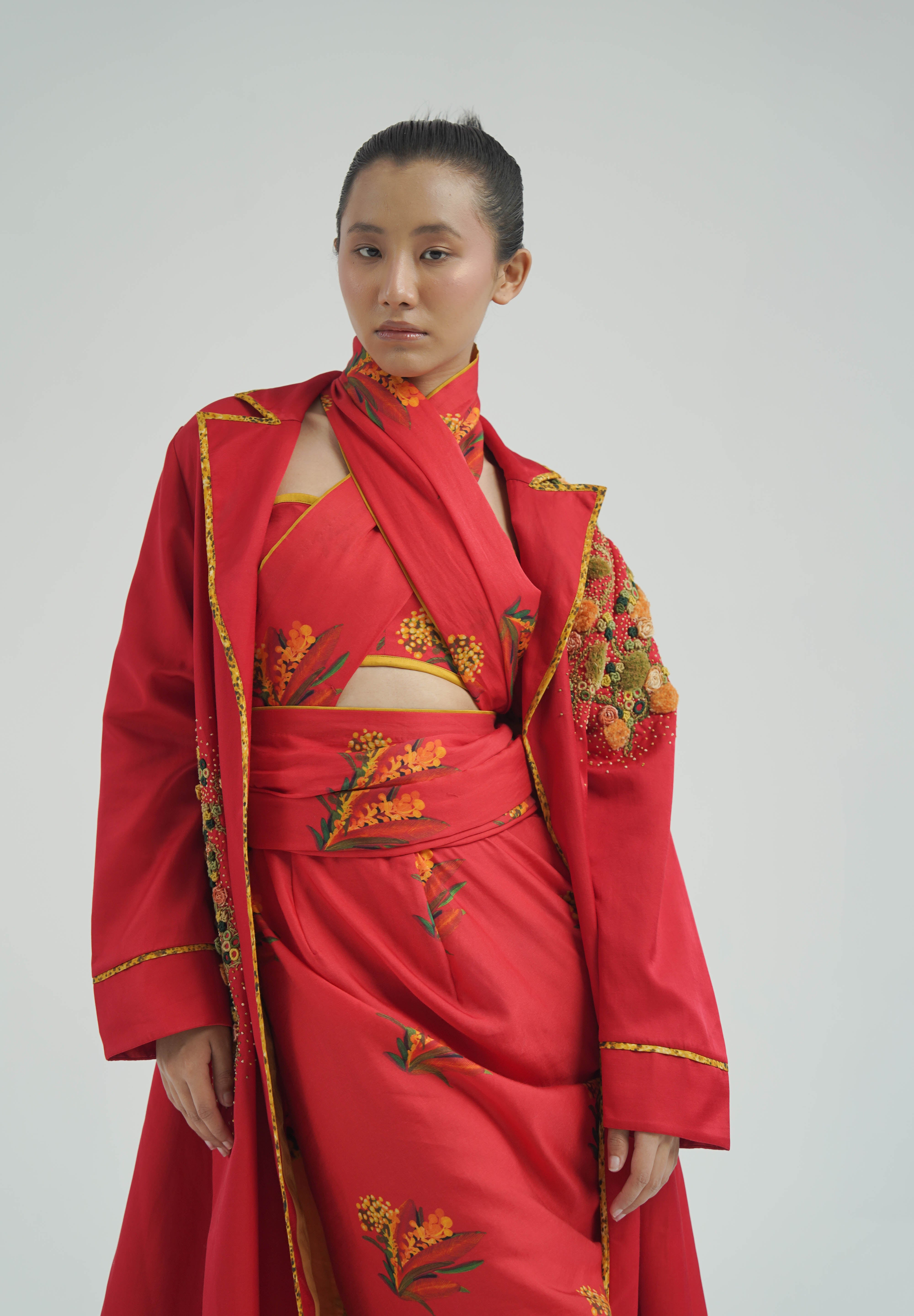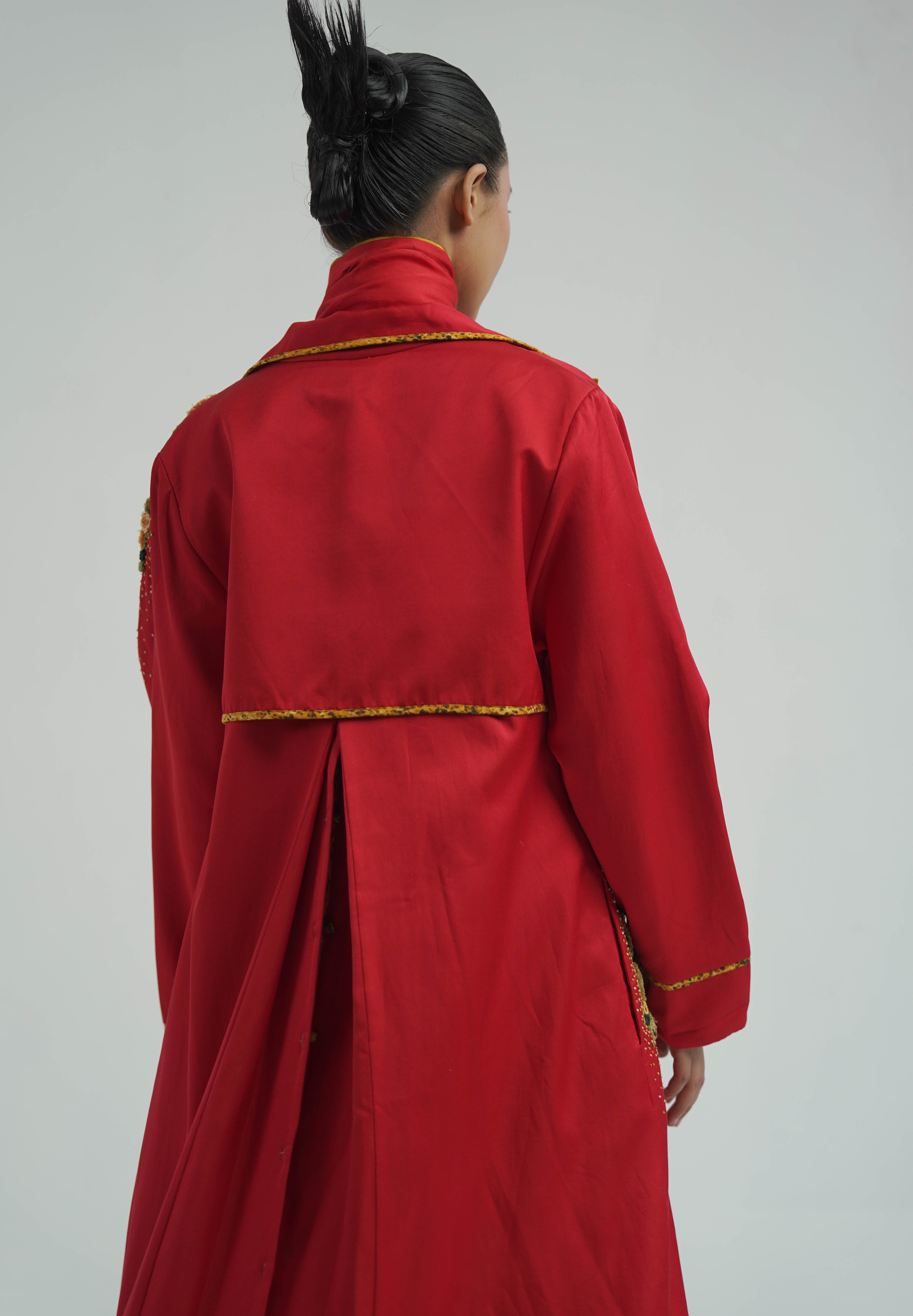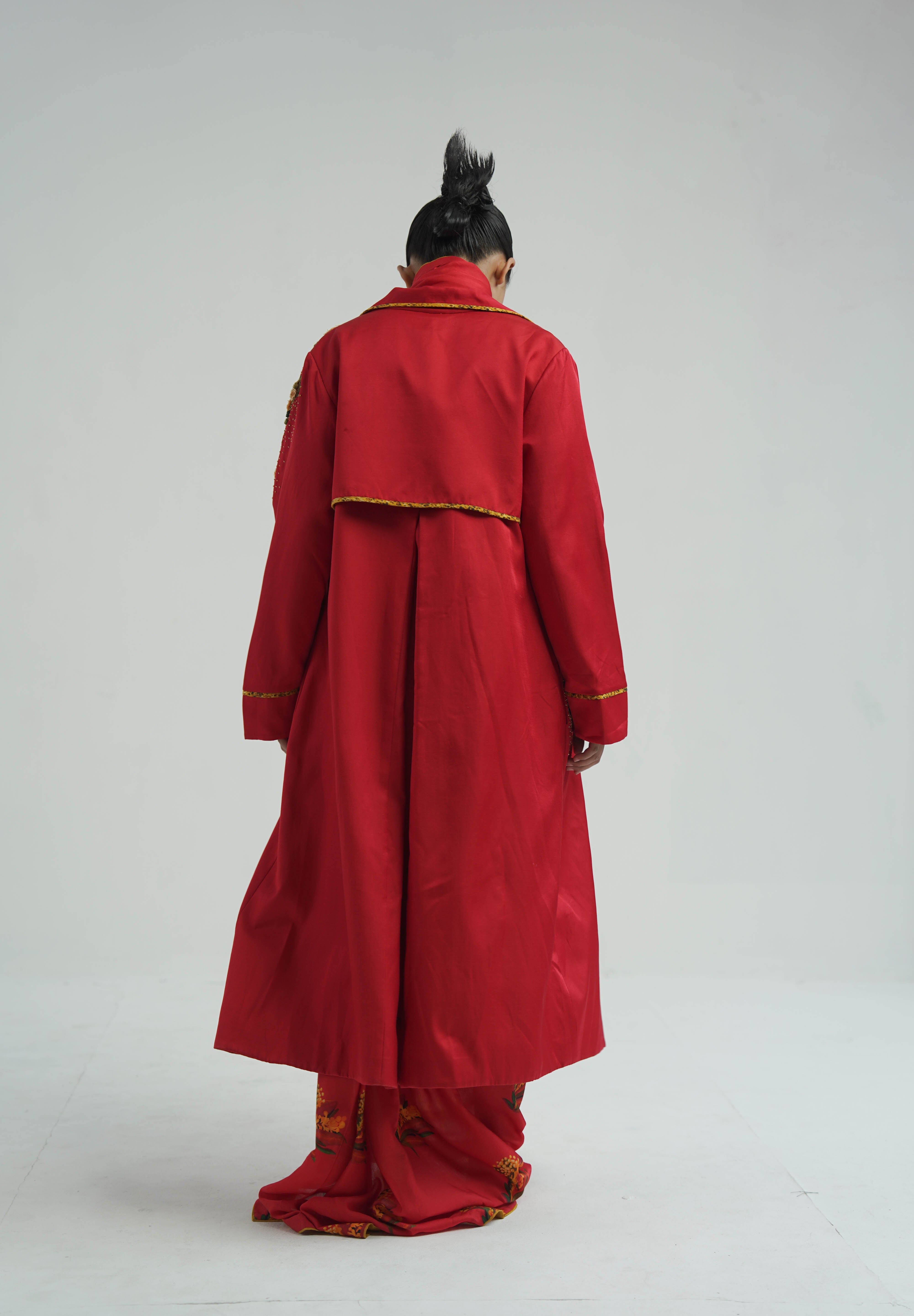 The Red Impasto Trench, crafted from luxurious silk, showcases exquisite hand embroidery that creates a captivating 3D texture, adding a unique and artistic dimension to the design. Impeccably finished with contrast piping details, this trench coat exudes sophistication and style. Additionally, it features functional buttons at the back, combining practicality with aesthetic appeal.