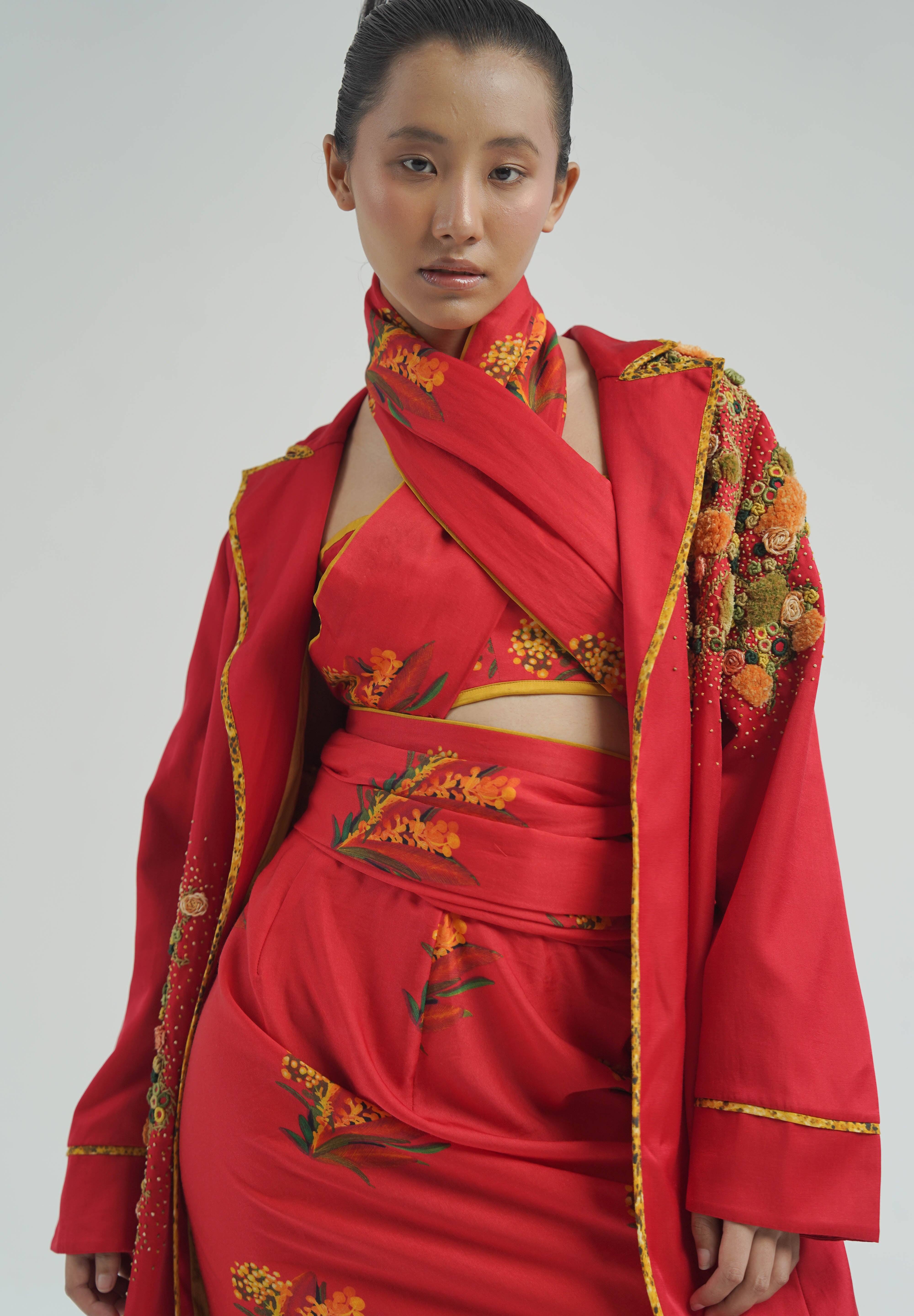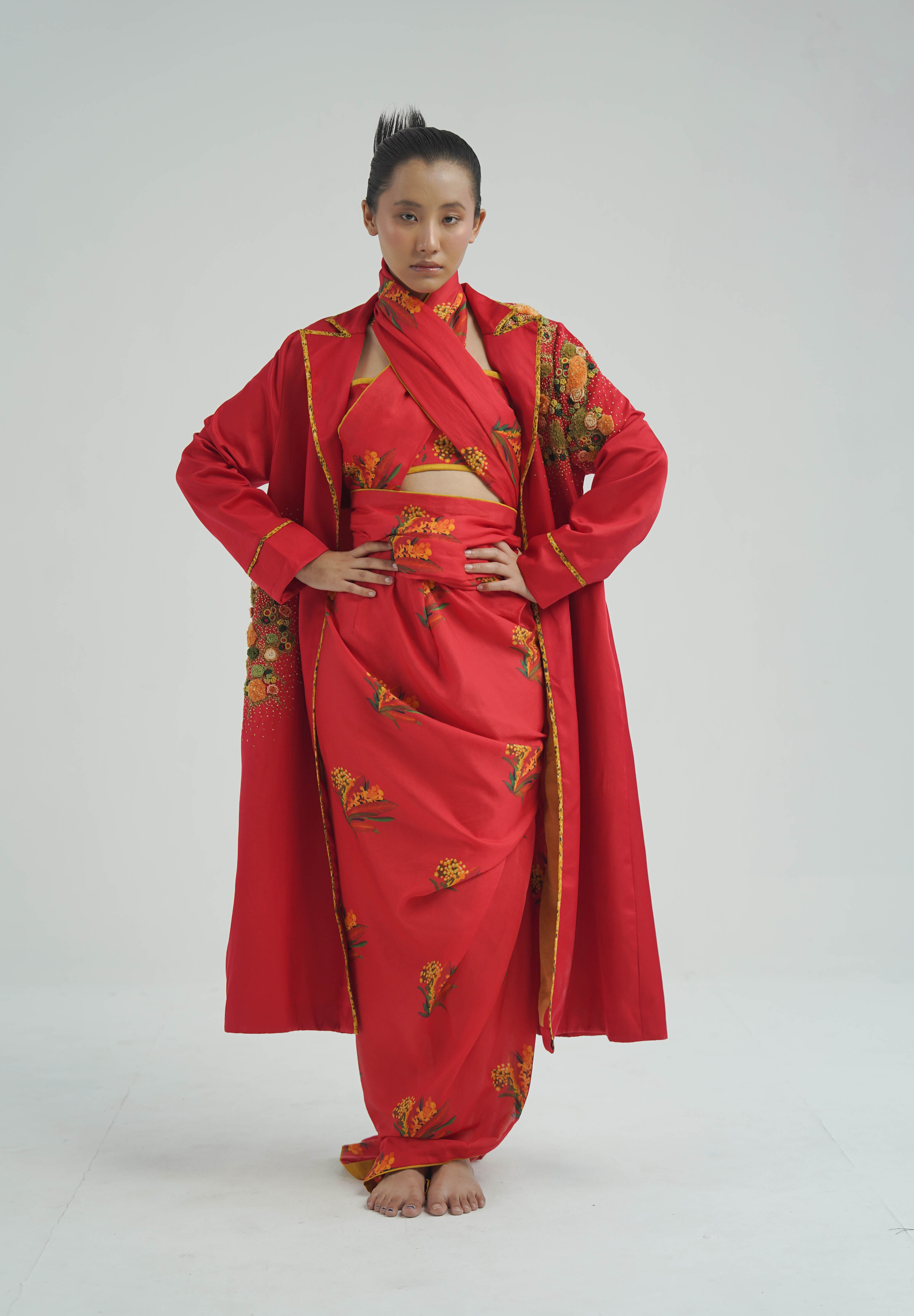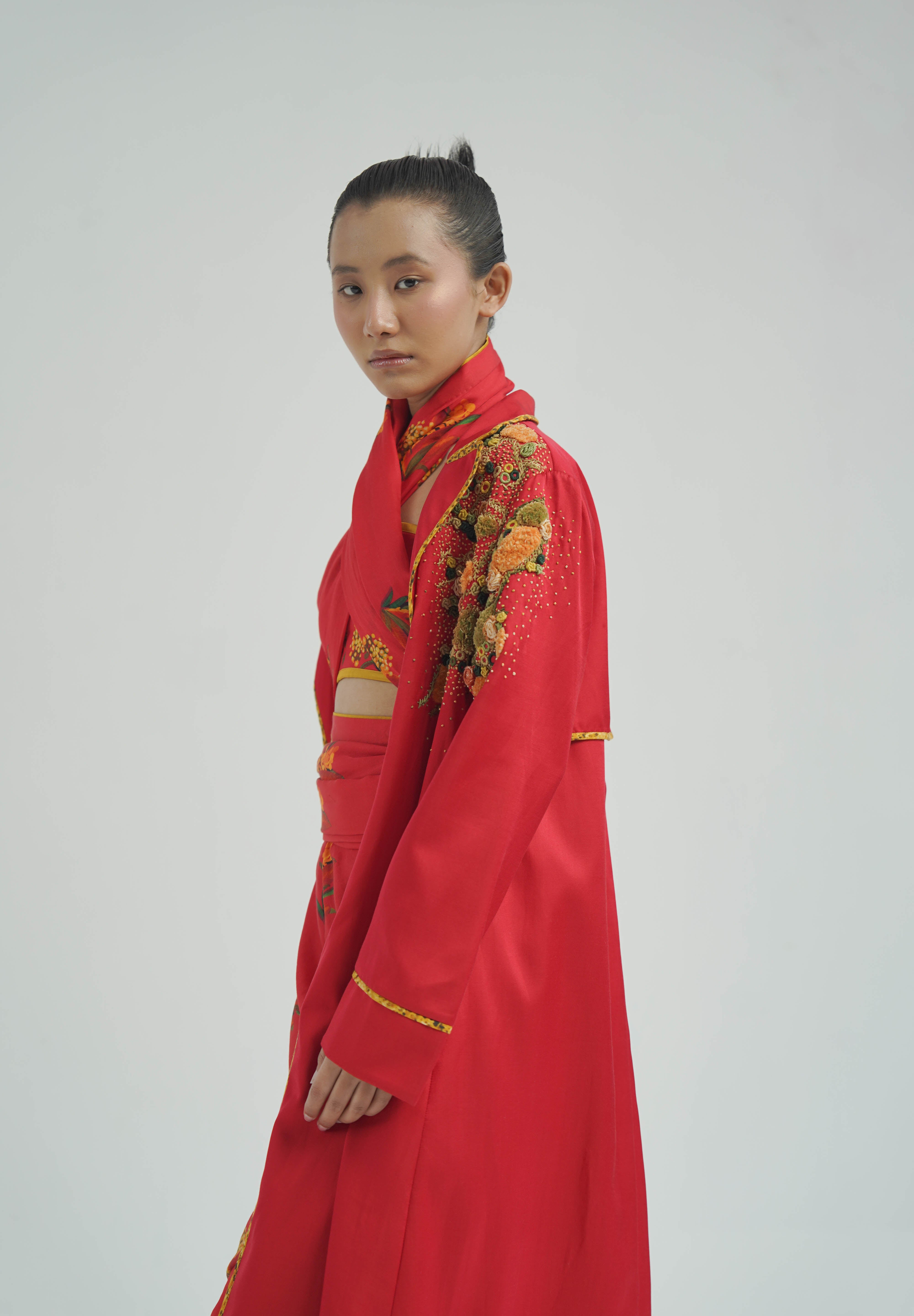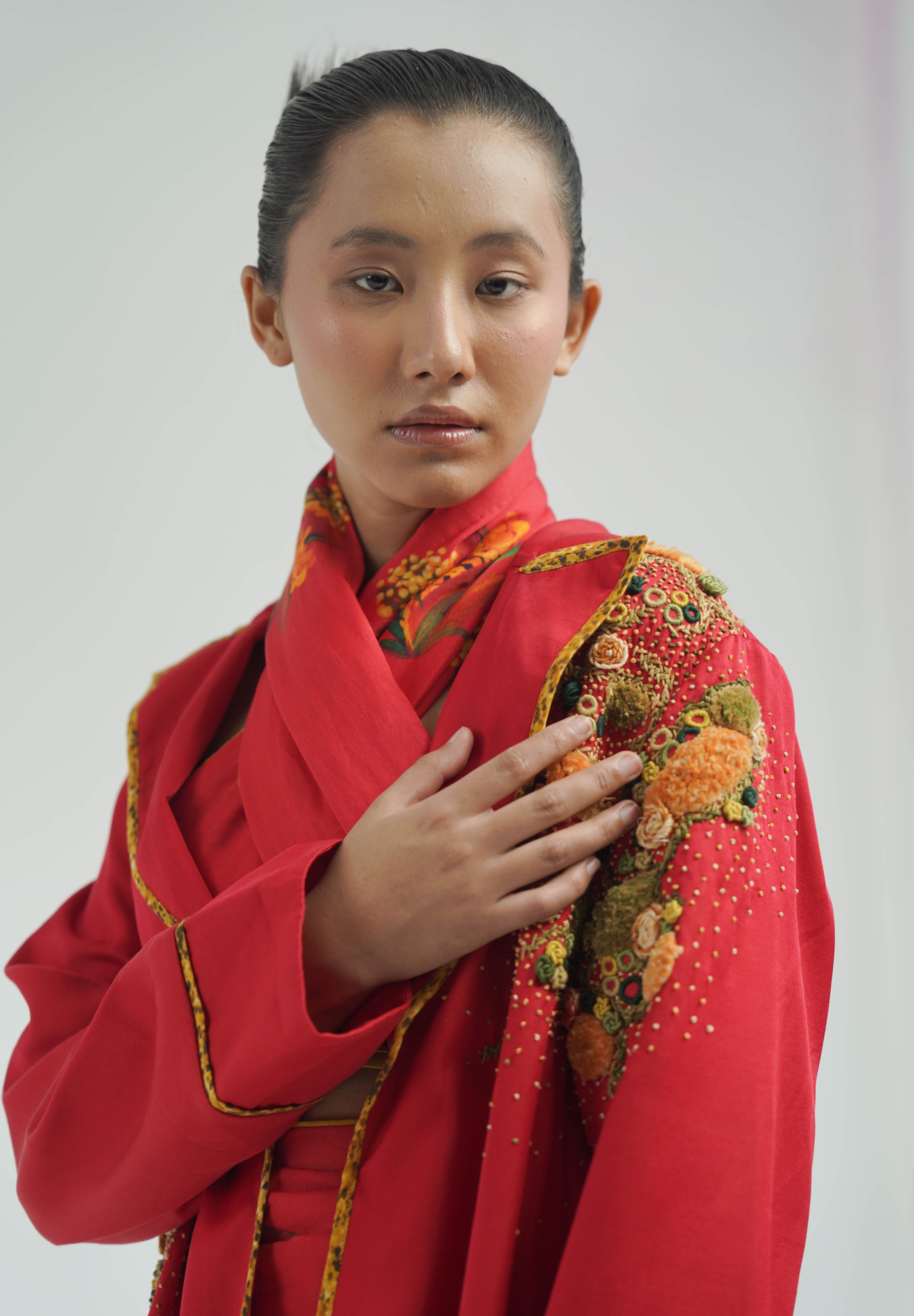The Red Impasto Trench, crafted from luxurious silk, showcases exquisite hand embroidery that creates a captivating 3D texture, adding a unique and artistic dimension to the design. Impeccably finished with contrast piping details, this trench coat exudes sophistication and style. Additionally, it features functional buttons at the back, combining practicality with aesthetic appeal.