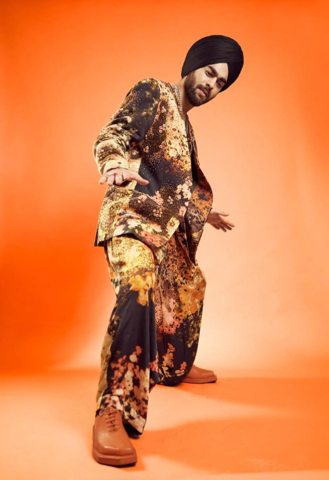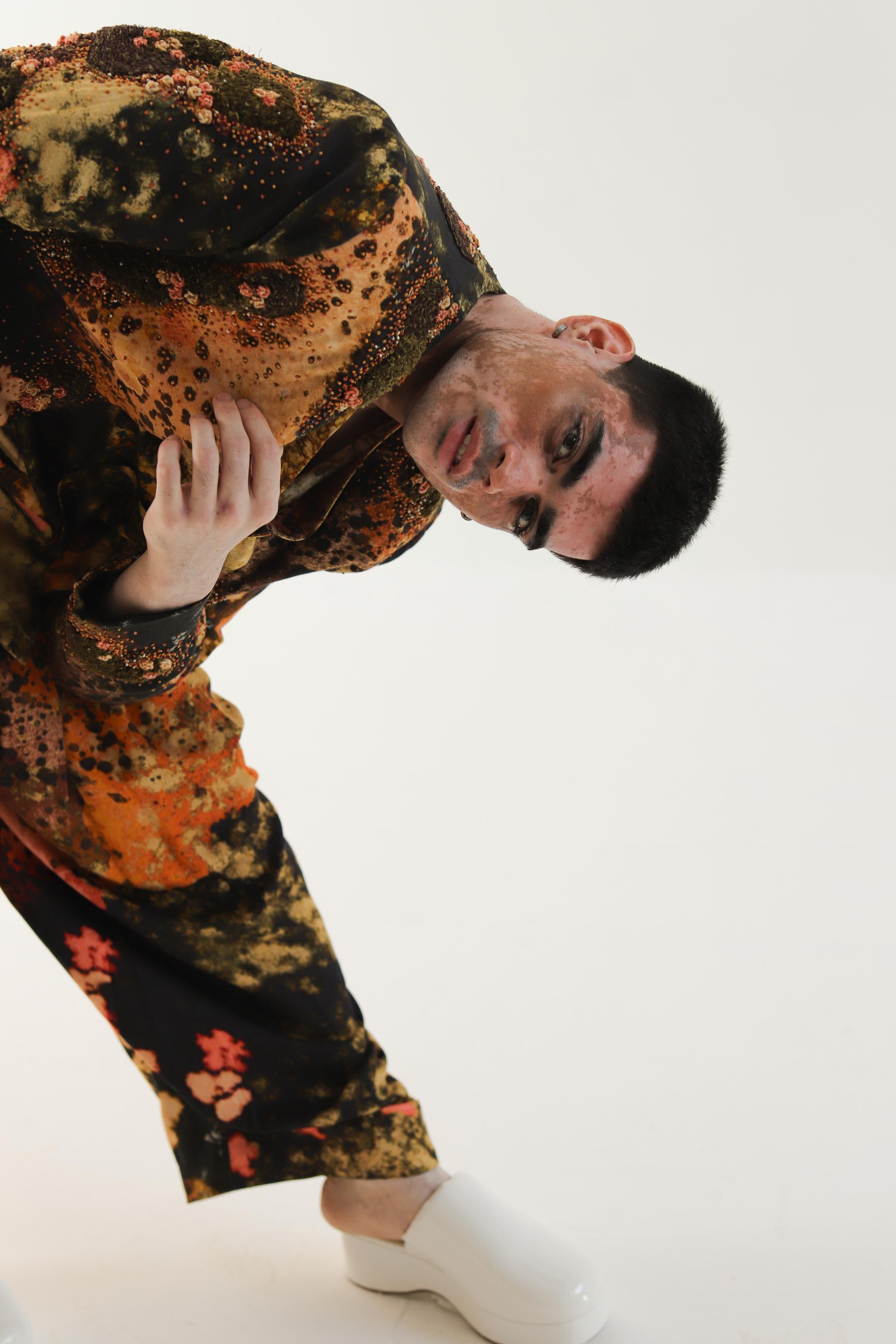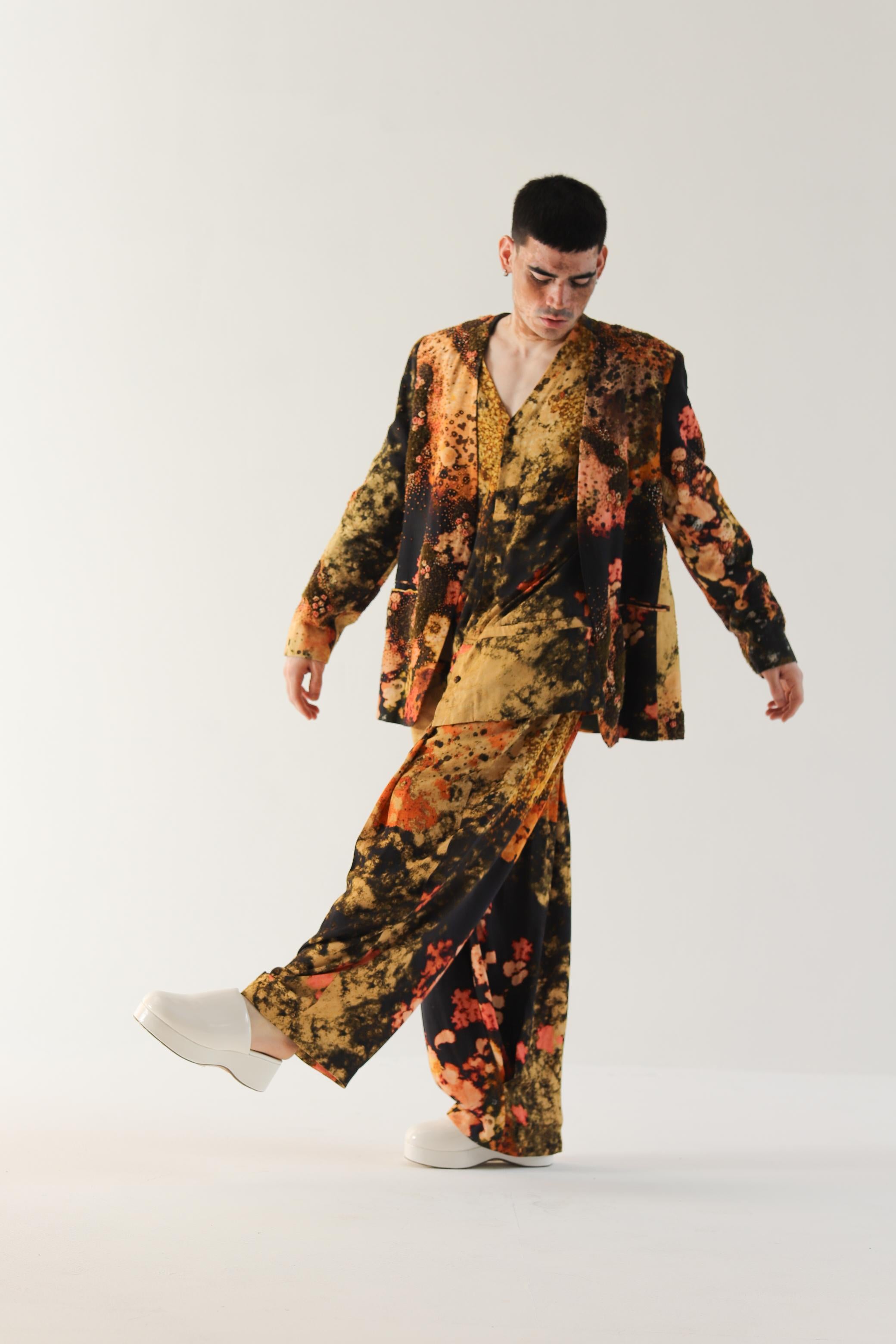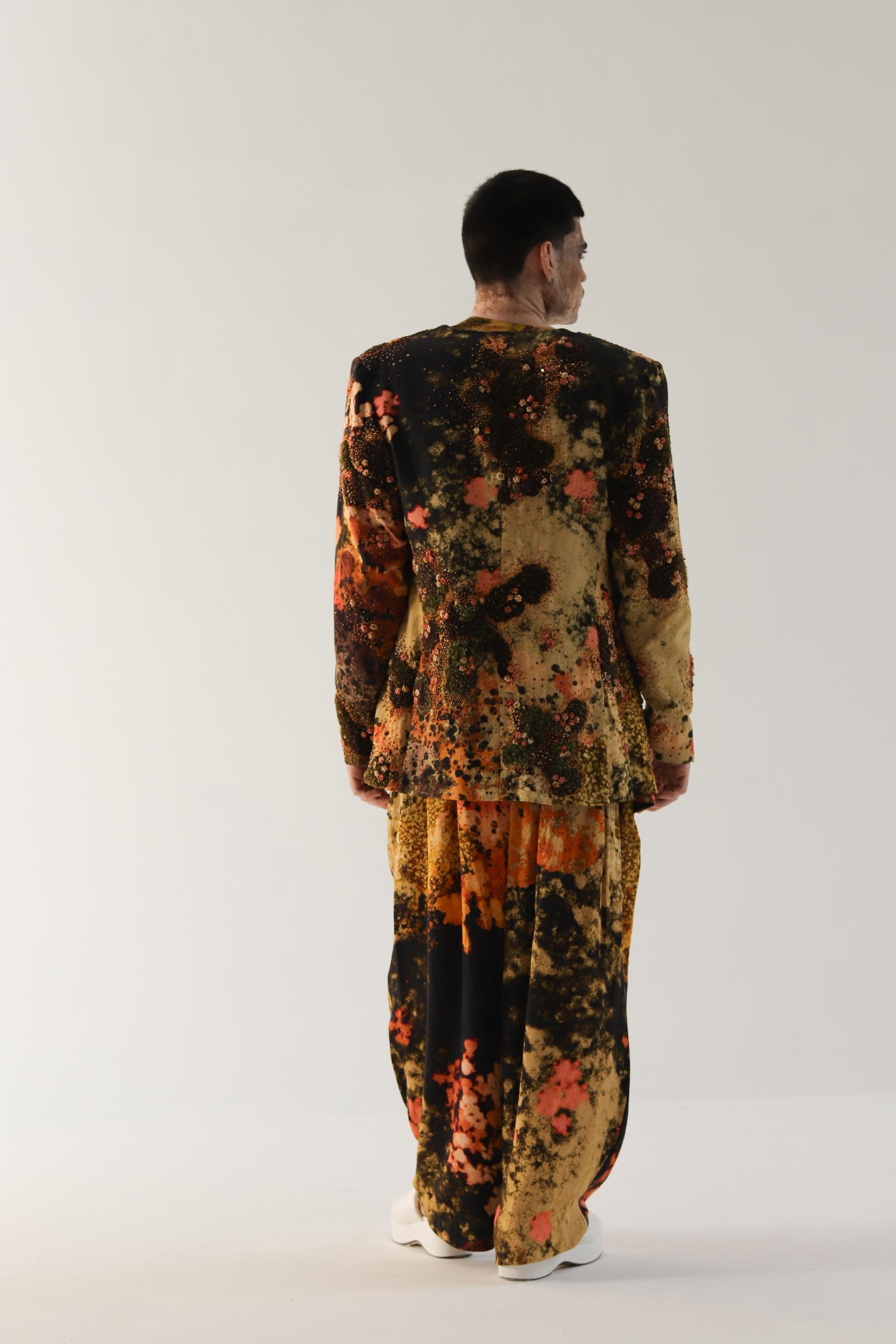 Wrap yourself in a dream with the Reverie Print Embroidered Jacket, crafted in soft modal satin. This wearable canvas comes to life with a surreal landscape digitally printed and hand-painted, creating a mesmerizing tapestry of imagination. The intricate hand embroidery adds depth and texture, featuring French knots, bullion flowers, and captivating textural spaces.Designed with a relaxed silhouette, with a graceful v-front opening. Practicality meets elegance with pockets on both sides, making it not just a visual delight but a functional piece for your everyday adventures.