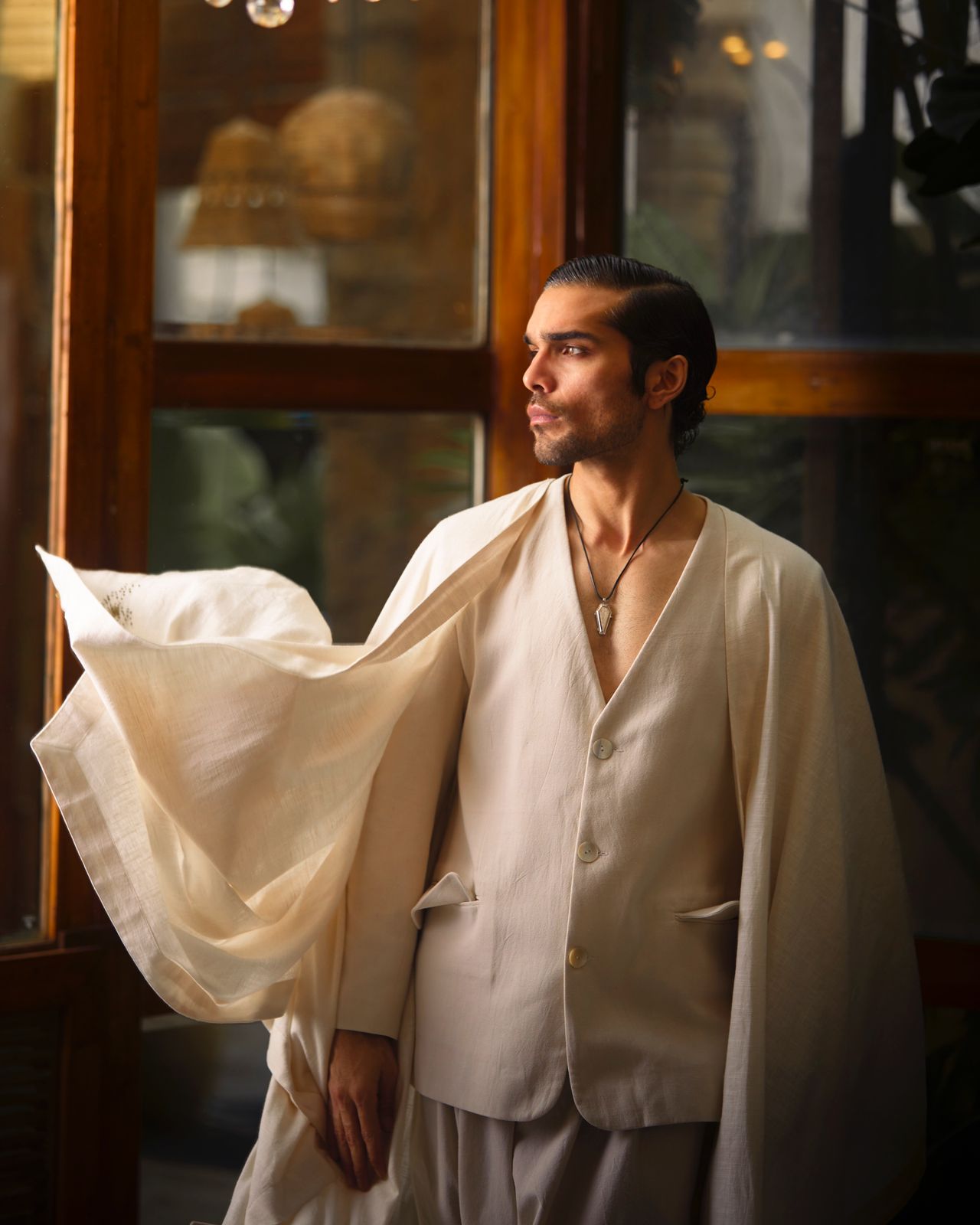 This Ivory Cape Overlay is meticulously crafted from premium cotton, seamlessly blending luxury with comfort. Designed for a relaxed fit that exudes ease, it is finished with exquisite hand-embroidered detailing.