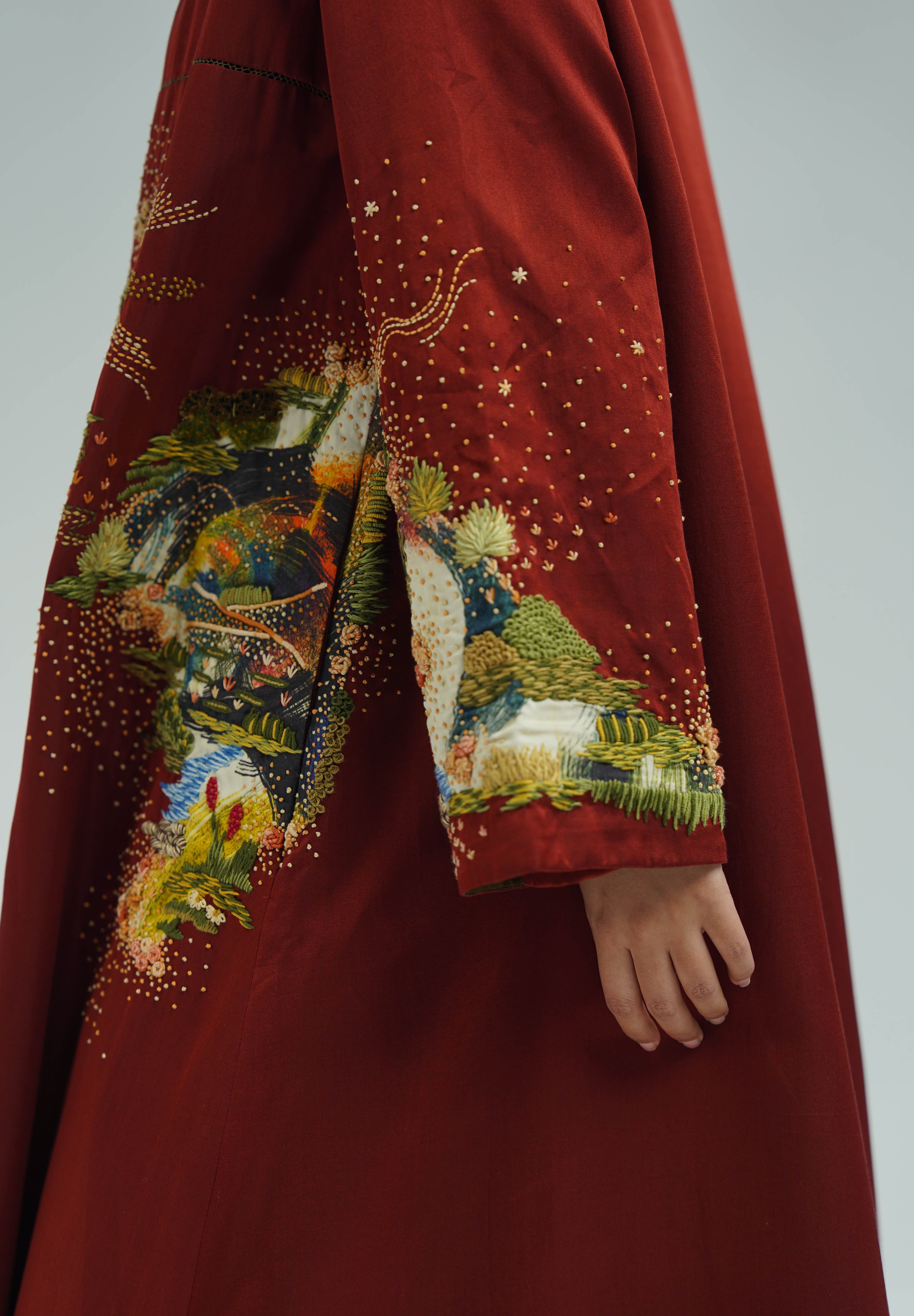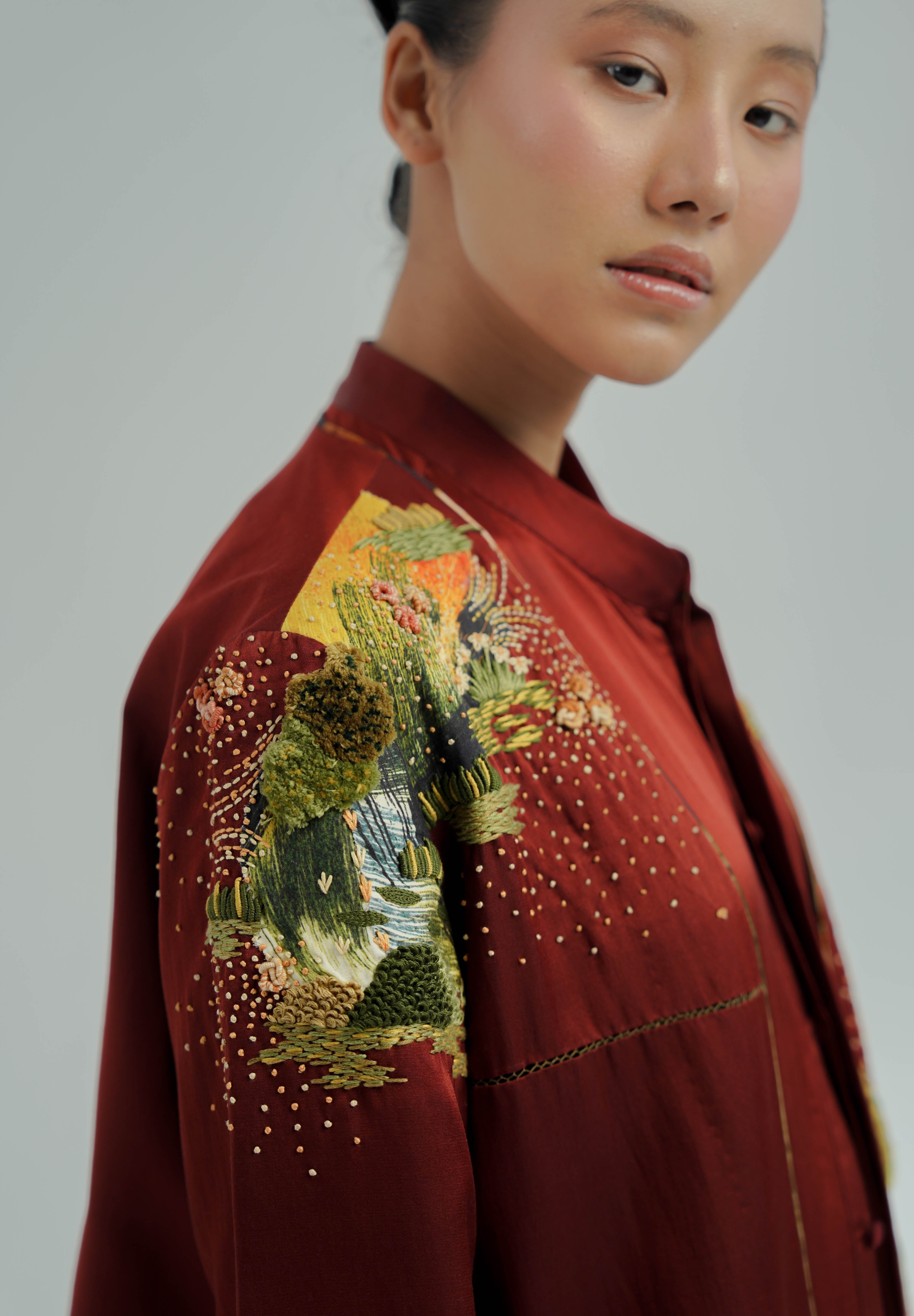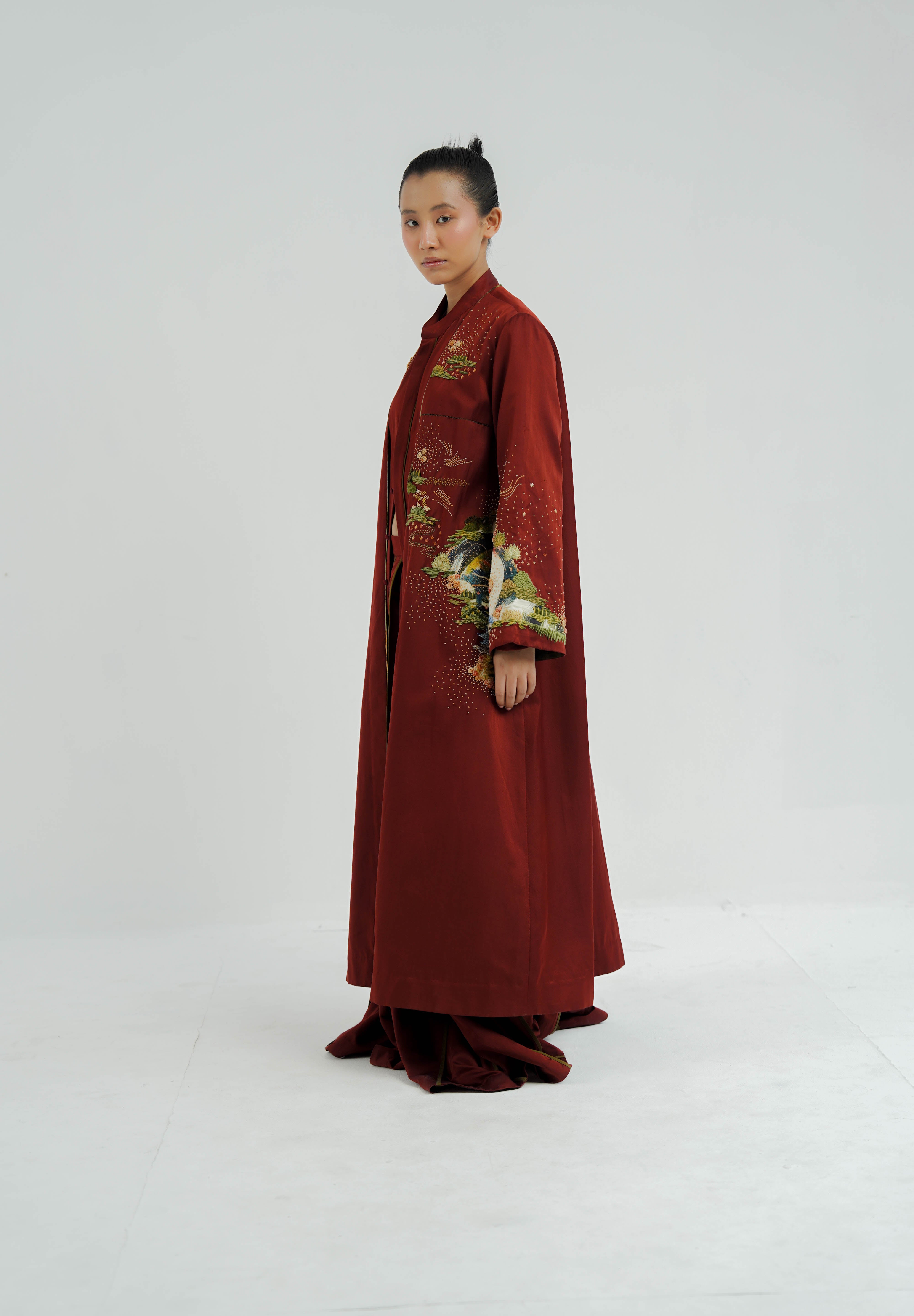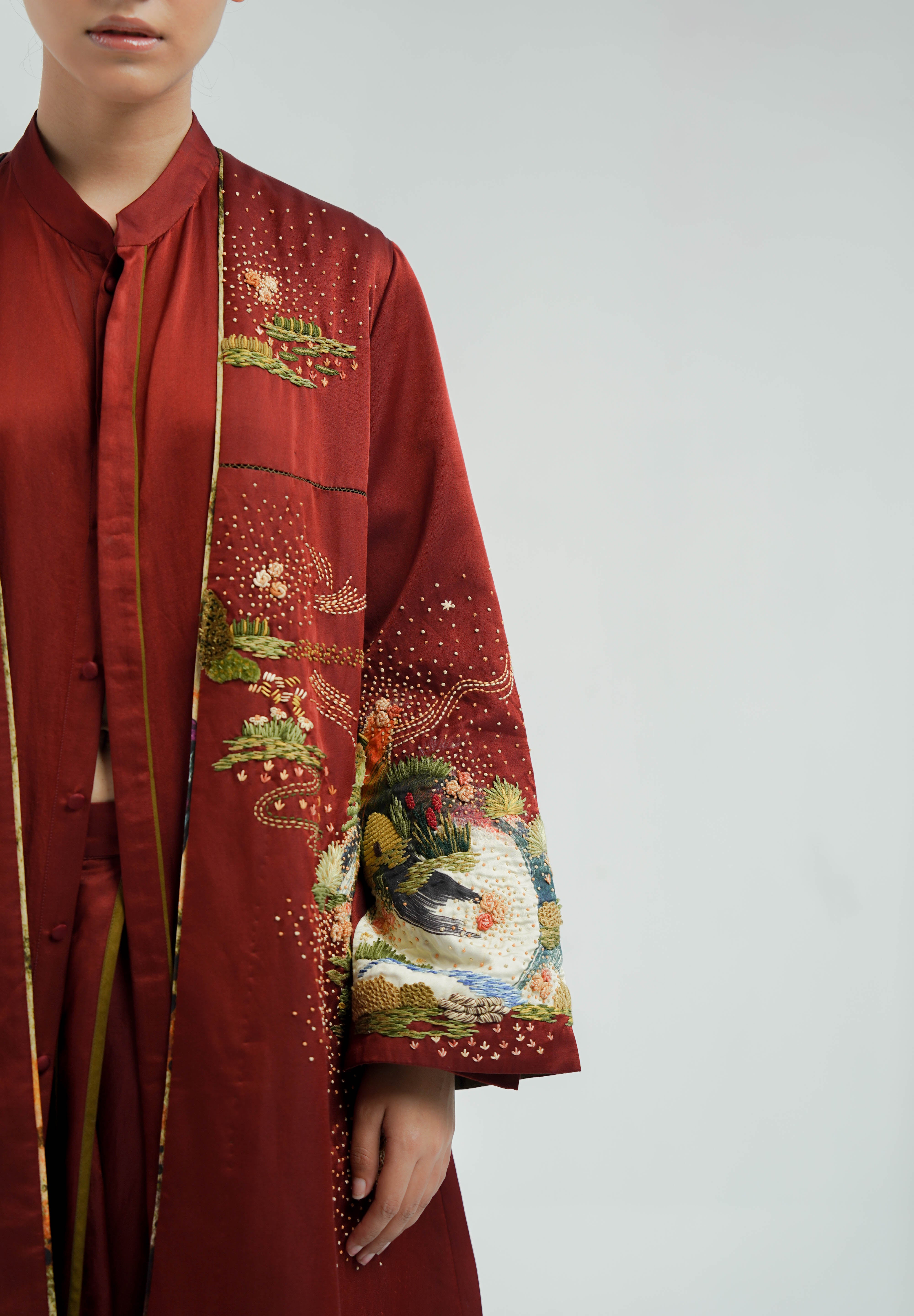 Discover elegance with our Sakura Overlay, exquisitely crafted from luxurious silk. Showcasing a hand painted, digitally printed plum buta design, this set combines style and comfort. It features a relaxed fit with front-open pockets, accented by contrast plum piping and a refined metal sequin edge finish.