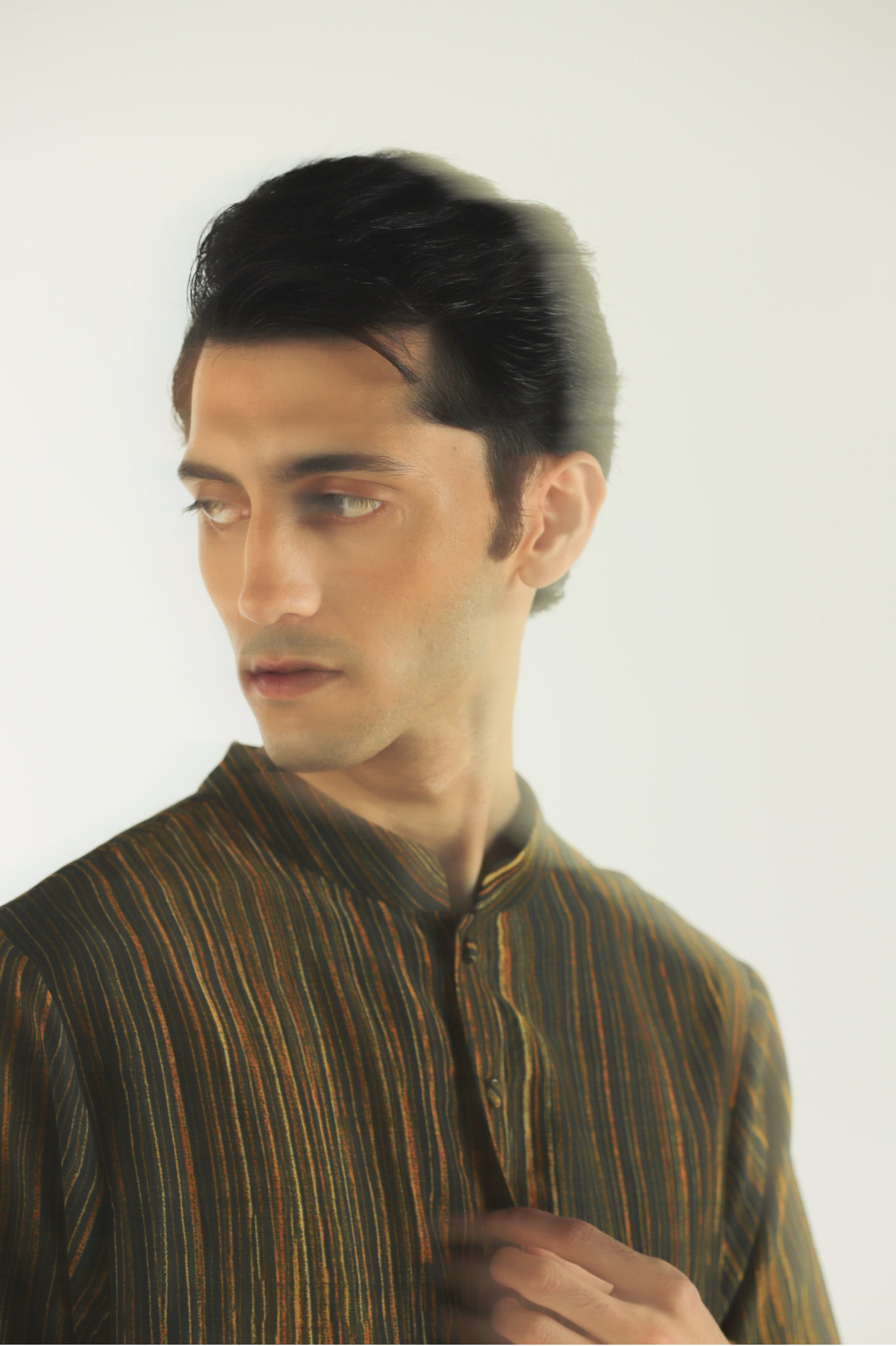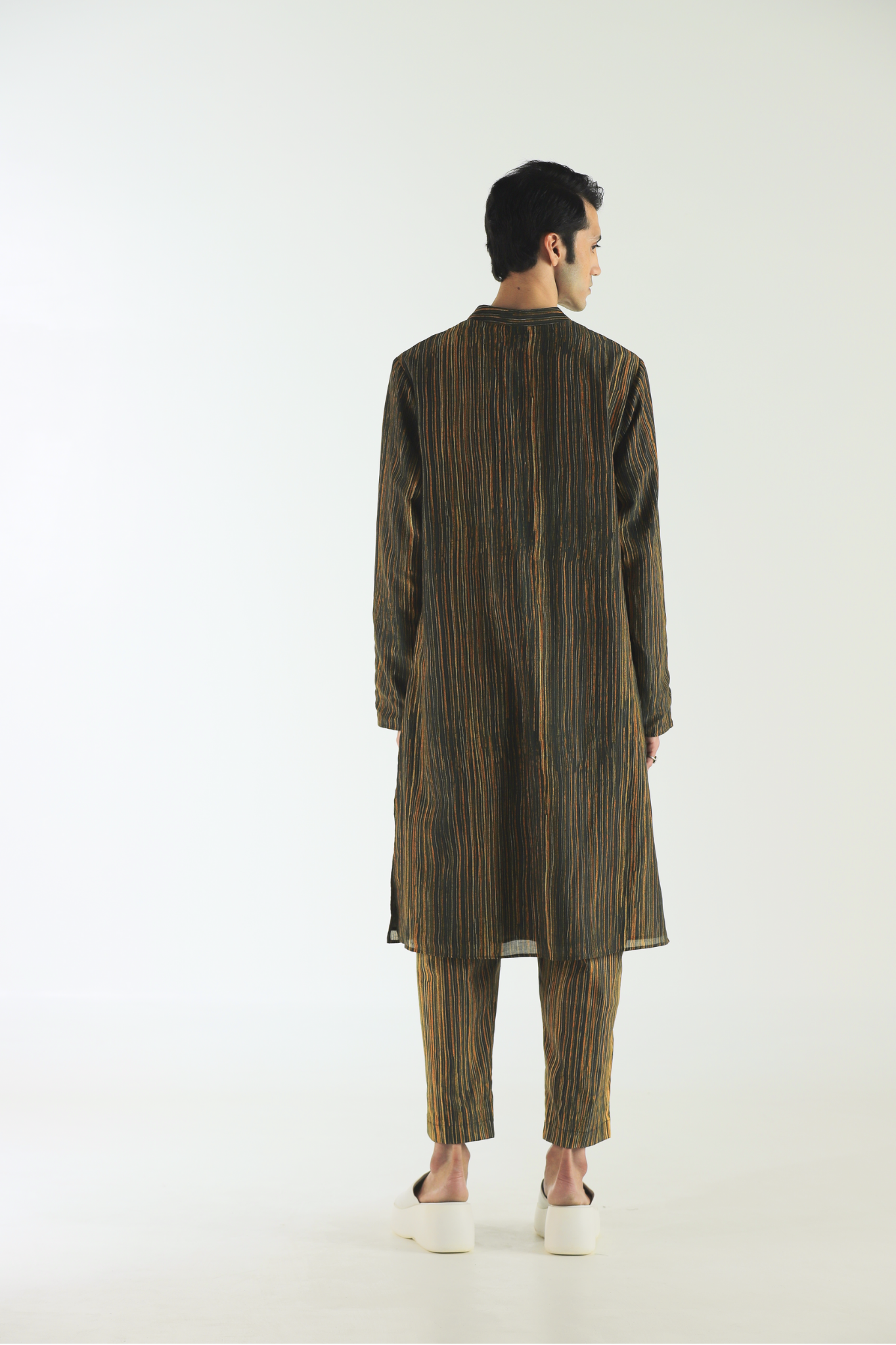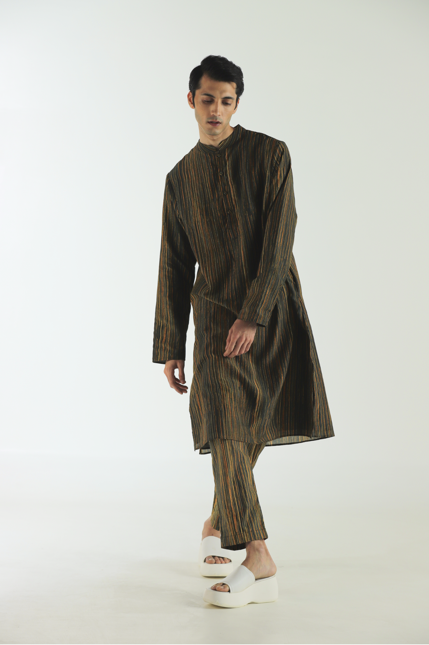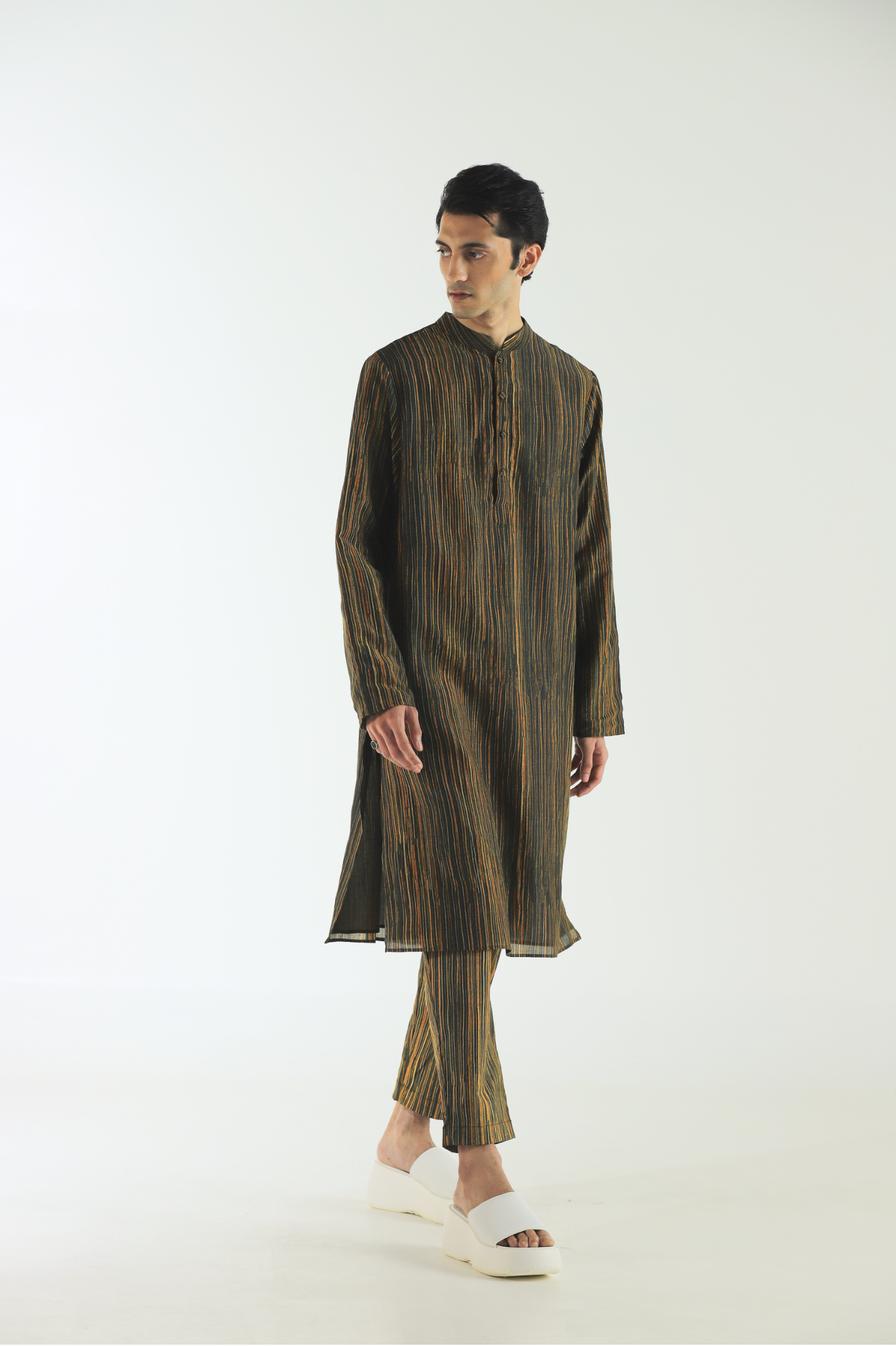 This ensemble is meticulously crafted in cotton silk, paired with digitally printed cotton lycra relaxed fit pants marrying luxury with comfort. Designed for a relaxed fit that exudes ease and comfort. This multi amber stripe kurta set is finely tailored and finished.
