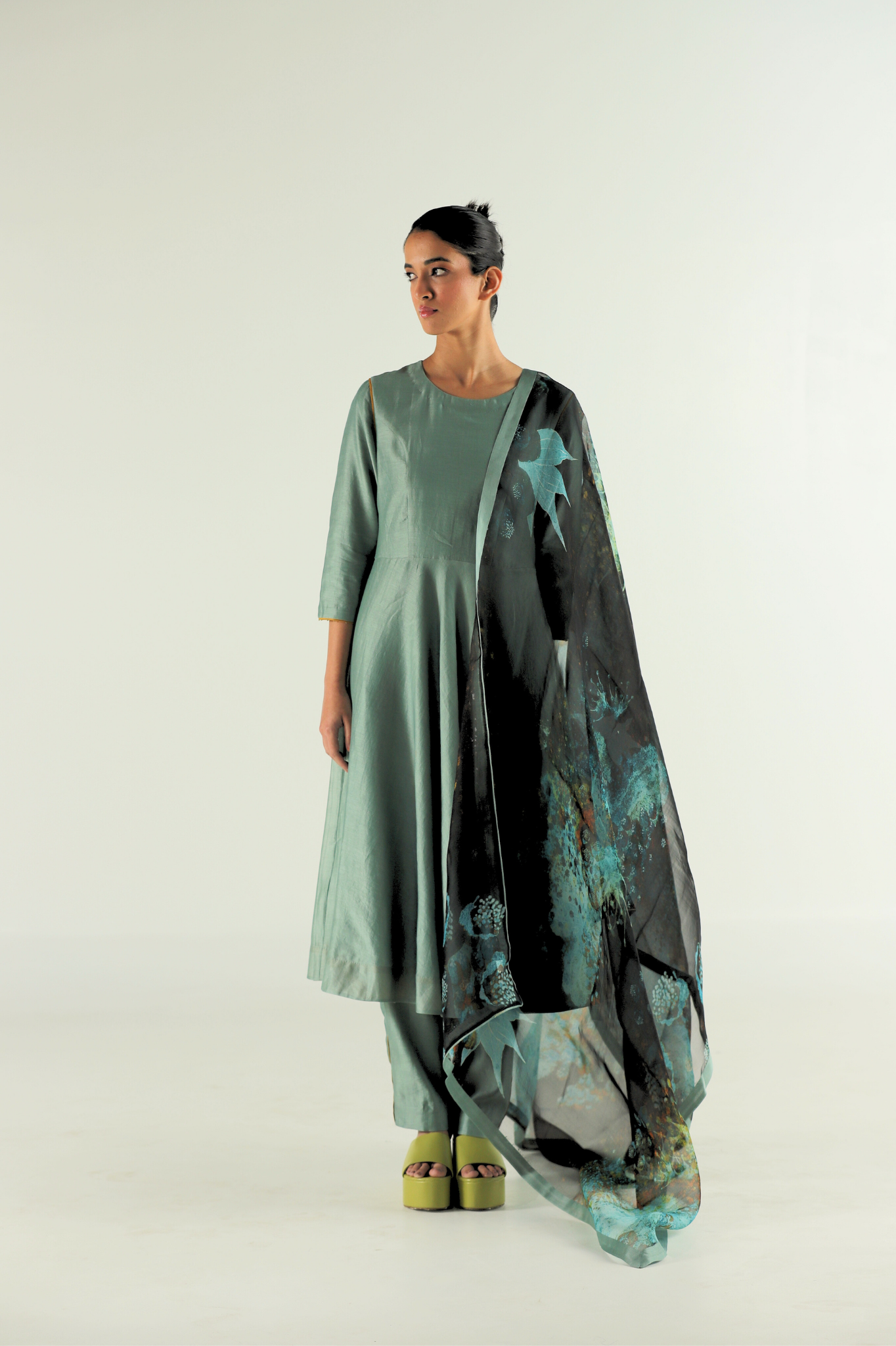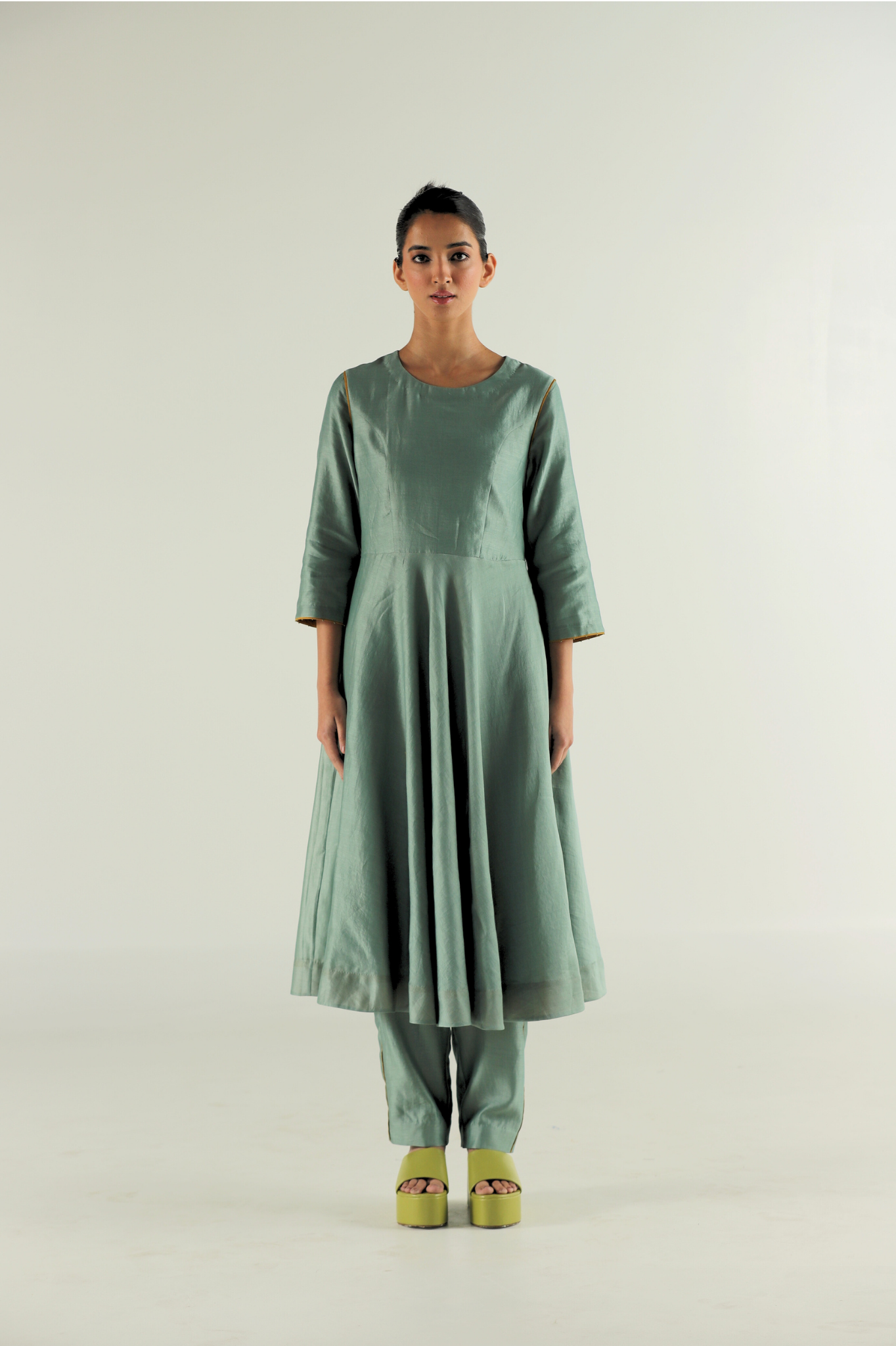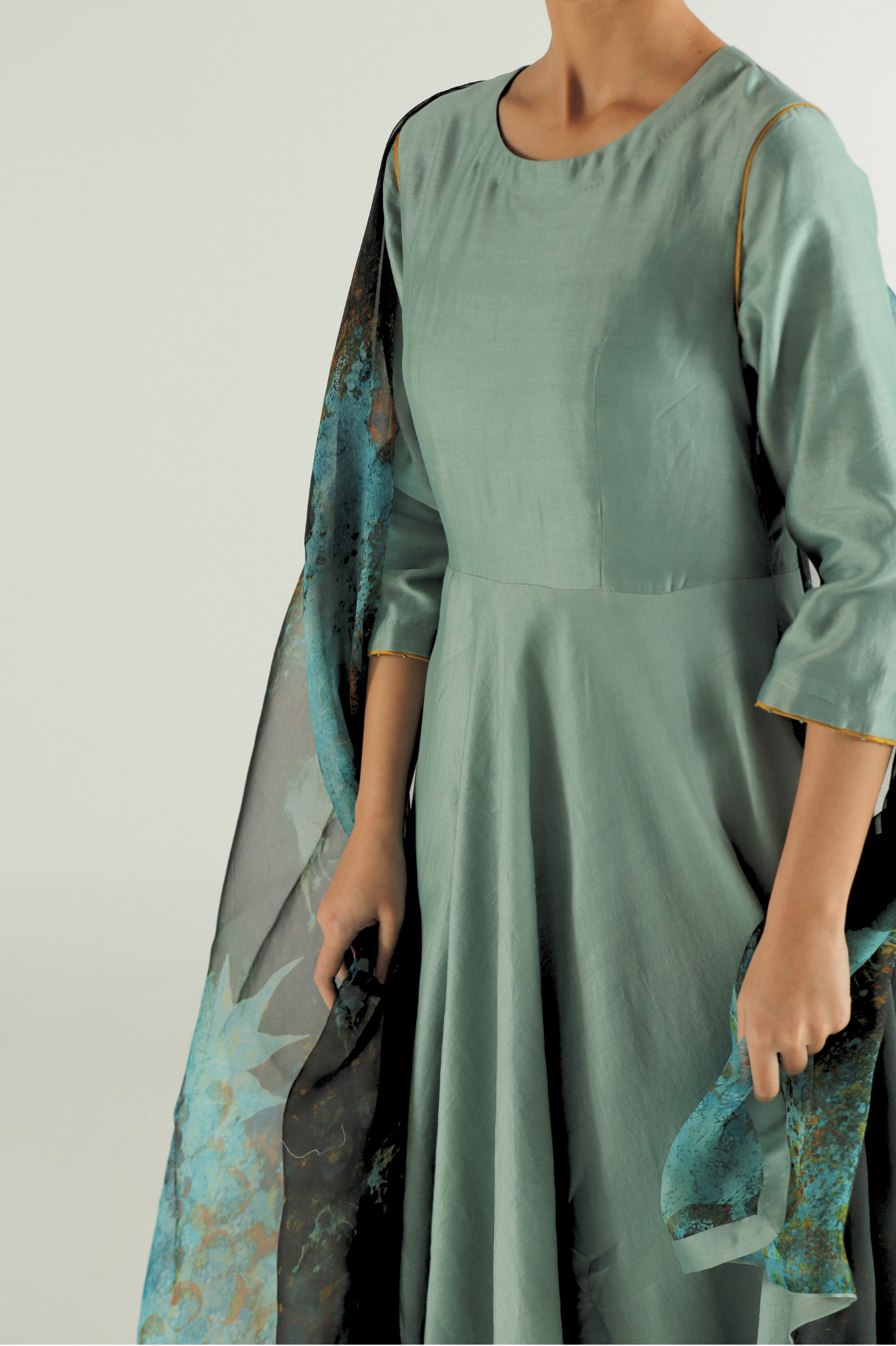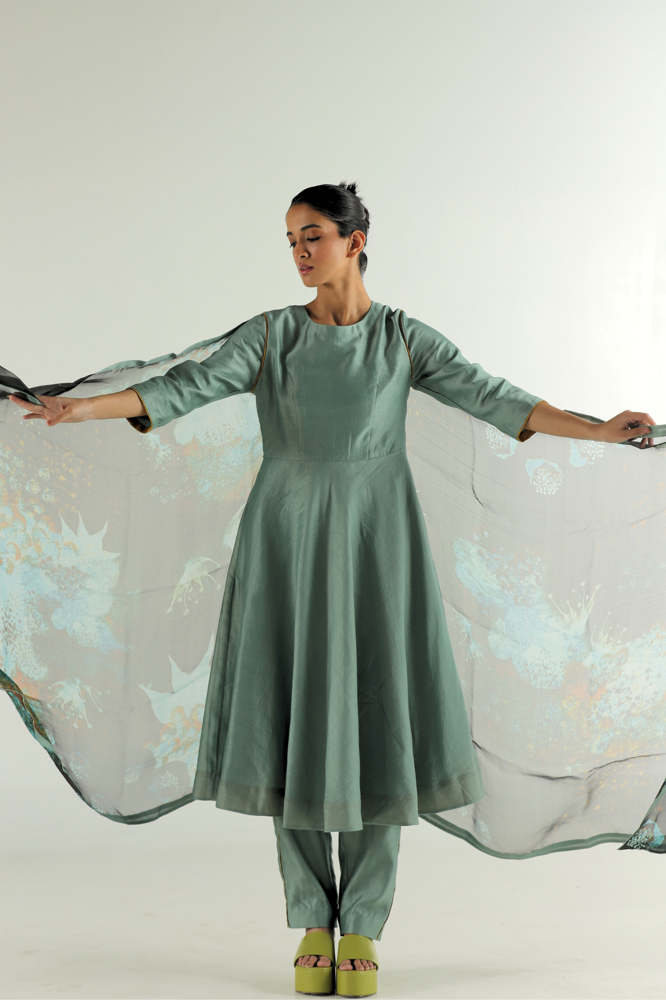 Our Teal Blue Ghera Anarkali, crafted from pure silk Chanderi. This graceful ensemble, adorned with contrasting piping adds up to the details. Paired with straight-fit Chanderi bottoms, the outfit is complemented by a floral dupatta featuring a clean edge finish.
