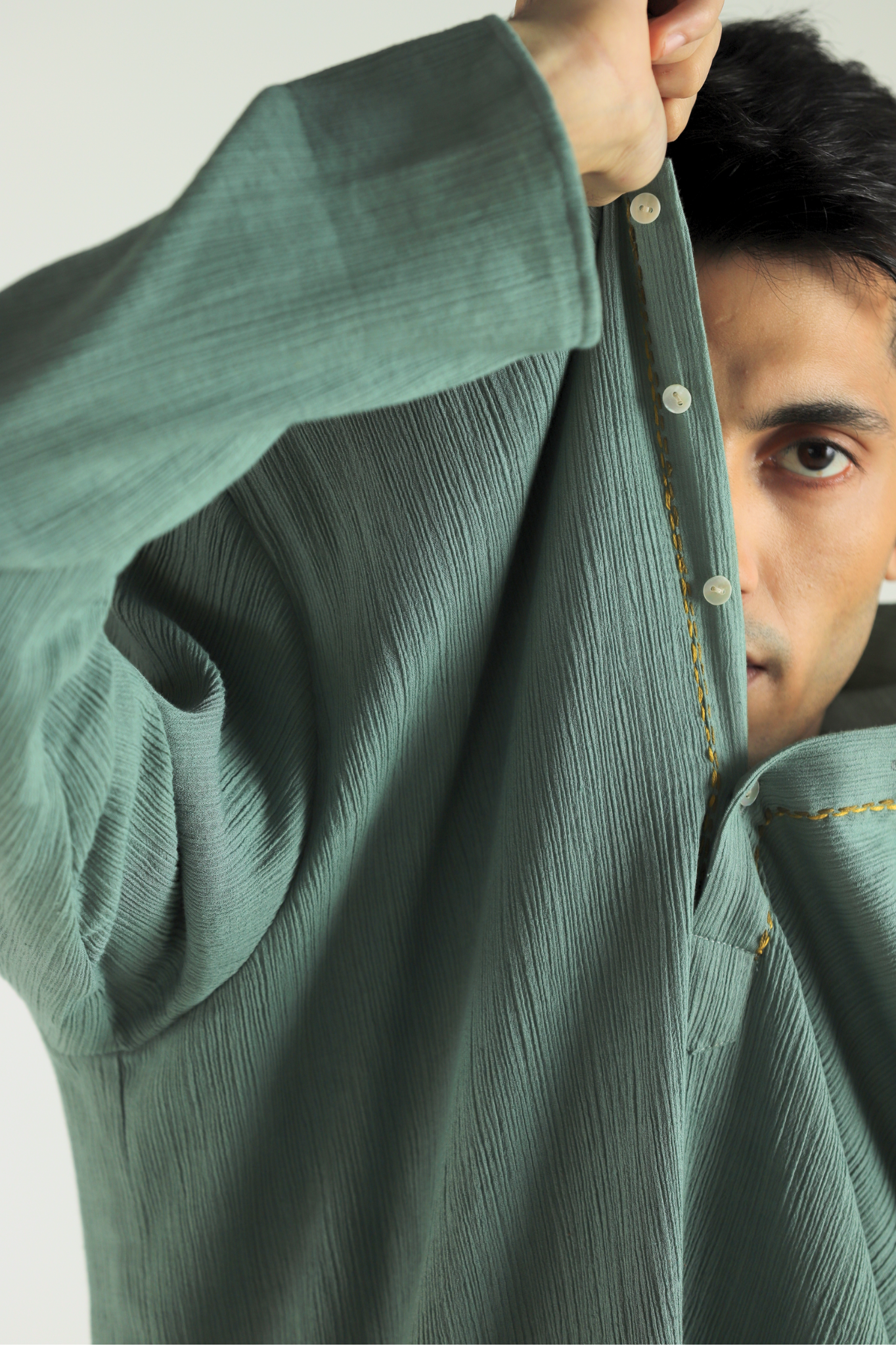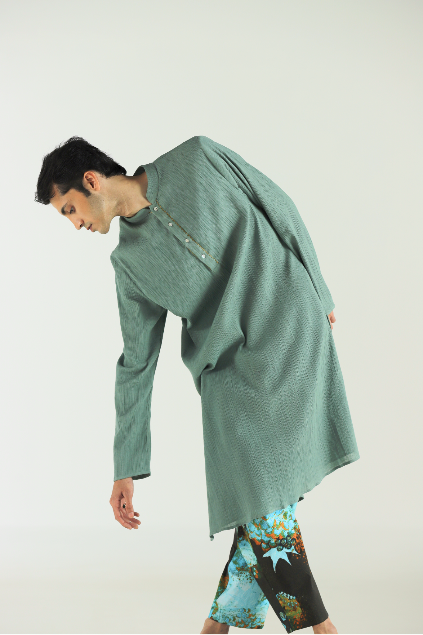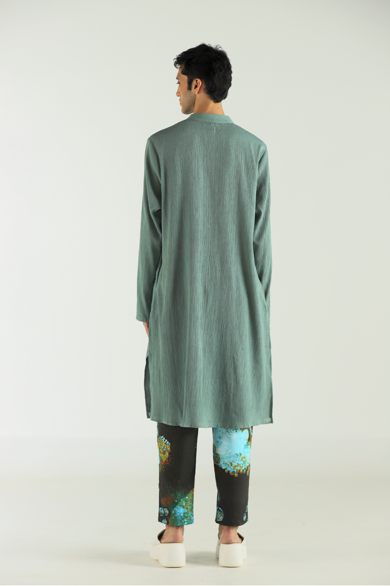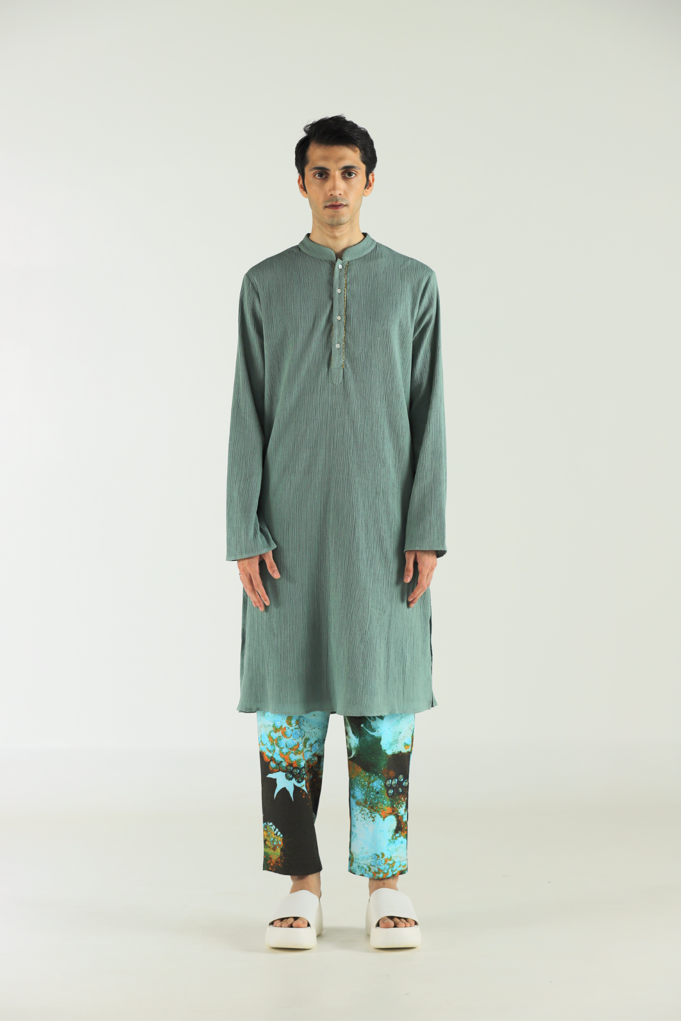 This ensemble is meticulously crafted in crush cotton, paired with digitally printed cotton lycra relaxed fit pants marrying luxury with comfort. Designed for a relaxed fit that exudes ease and comfort. This teal kurta set is finely tailored and finished.